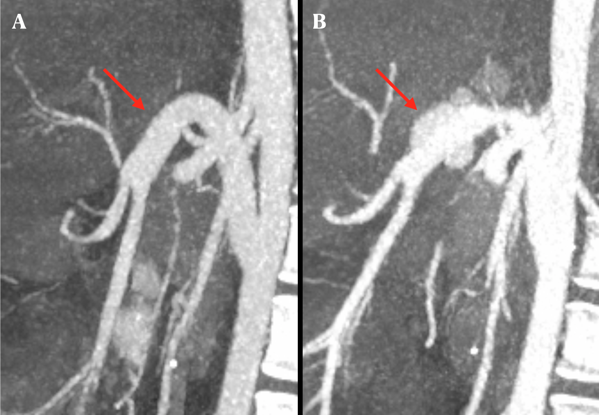Results: Out of 156 ITx performed, six patients (3.8%) experienced eight episodes of MA. Among them, four patients received a multi-visceral transplant, while two underwent a liver-small bowel transplant, all vascularised with infra-renal aortic conduits. The median age at MA diagnosis was 36.5 years (range 24-70), occurring bimodally either early post-transplant (2, 3, 6, 8 weeks) or in a later phase (55, 377 weeks). Two patient experienced recurrence, occurring on average 132.4 weeks from the initial diagnosis (range 69.6-195.3). A history of hollow viscus perforation or anastomotic leak after transplant was identified in all cases except one (83.4%). Diagnosis was made peri-operatively in two cases (33.3%) due to ruptured aneurysms necessitating urgent laparotomy, while the remaining cases were diagnosed via angio-CT (Figure 1), typically in the context of abdominal pain and ongoing sepsis.