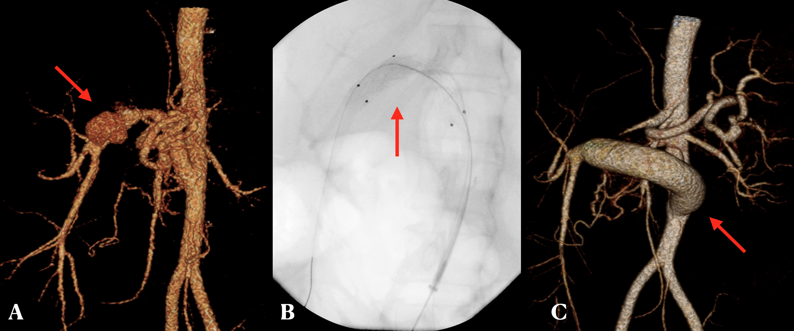 The two recurrences were clinically more subtle, identified incidentally on a CT in one case or associated with abdominal discomfort and maelena in the other. Apart from targeted antibiotic and antifungal treatment, management strategy pivoted around endovascular stent grafting (ESG) followed by a subtotal resection of the aneurysmal vessel and creation of a new conduit (Figure 2) using third party vascular homograft.