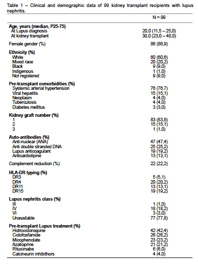 Conclusion: We presented the clinical charactistics and outcomes of 99 patients with LN submitted to KT. The extrarenal manifestations of SLE tend to reduce post-transplant. Post-transplant graft survival was similar to that of kidney transplants for other causes at this institution. The presence of HLA DR 15 and male sex appear to be associated with greater graft loss in LN patients.