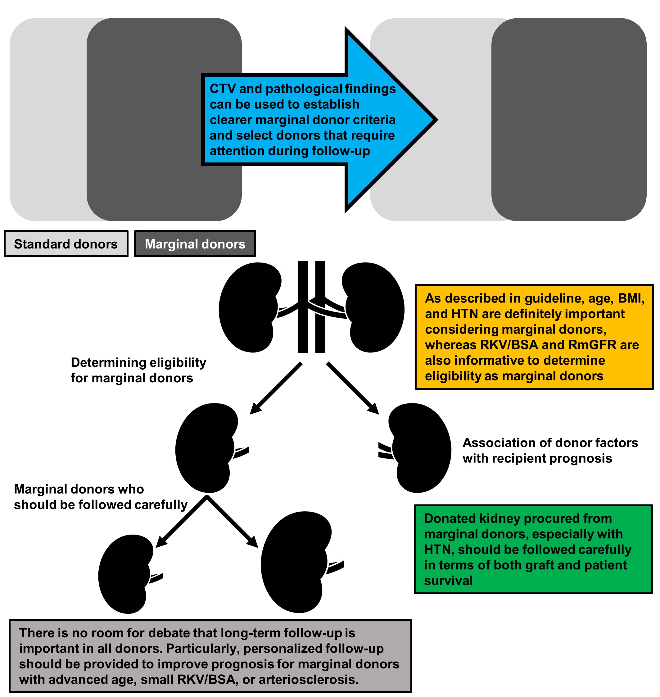 Results: LKDs were divided into two groups; 89 as standard donors (SDs) and 39 as marginal donors (MDs). The median age and estimated glomerular filtration rate (eGFR) were 56 years and 80.7 mL/min/1.73m2 in SDs and 64 years and 72.2 mL/min/1.73m273 in MDs, respectively (P=0.0012 and P=0.031). Parameters calculated by renal volumetry were not significantly different between the two groups, while interstitial inflammation and interstitial fibrosis/tubular atrophy were significantly higher rate in MDs than those in SDs (P=0.031 and P=0.041). Multivariate analysis revealed that age <60, body mass index >25, residual kidney volume/body surface area (RKV/BSA) were independent factors for poor renal function preservation (odds ratio [OR] 2.56, 95% confidence interval [CI] 1.06–6.16; OR 2.99, 95%CI 1.11–8.05; OR 4.11, 95%CI 1.70–9.96, respectively). Subgroup analysis involved in MDs revealed that RKV/BSA and arteriosclerosis were independent factors for poor renal function preservation (P=0.010 and P=0.025). Furthermore, with regard to graft survival in recipients, recipients donated from MDs were significantly high risk of graft loss compared with those from SDs (P=0.0019).