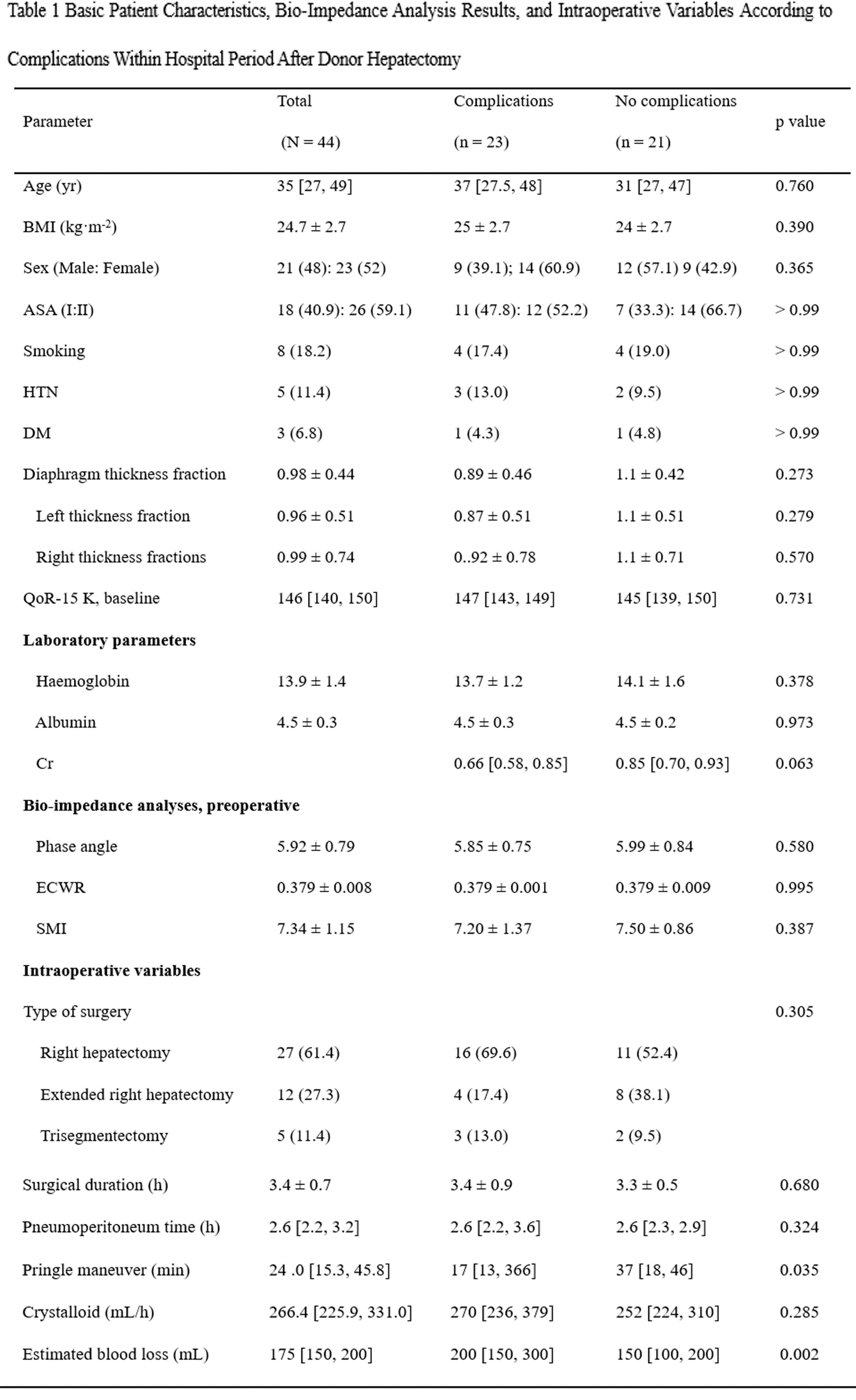 Method: This prospective randomized study was conducted at Samsung Medical Center in Korea between May 2023 and October 2023. Forty-four adult donors with an American Society of Anesthesiologists (ASA) Physical Status classification I–II who underwent elective laparoscopic hepatectomy were enrolled. Each patient underwent BIA, including PA assessment before surgery (PApre) and one day after surgery (PApost). Demographic and baseline data were extracted from electronic medical records. The day before surgery, experienced investigators performed BIA measurements and ultrasound examinations for diaphragmatic thickness fraction. The primary outcome was the association of PA with a composite of in-hospital complications after donor hepatectomy, including surgical complications, postoperative pulmonary complications, ileus, and acute kidney injury.