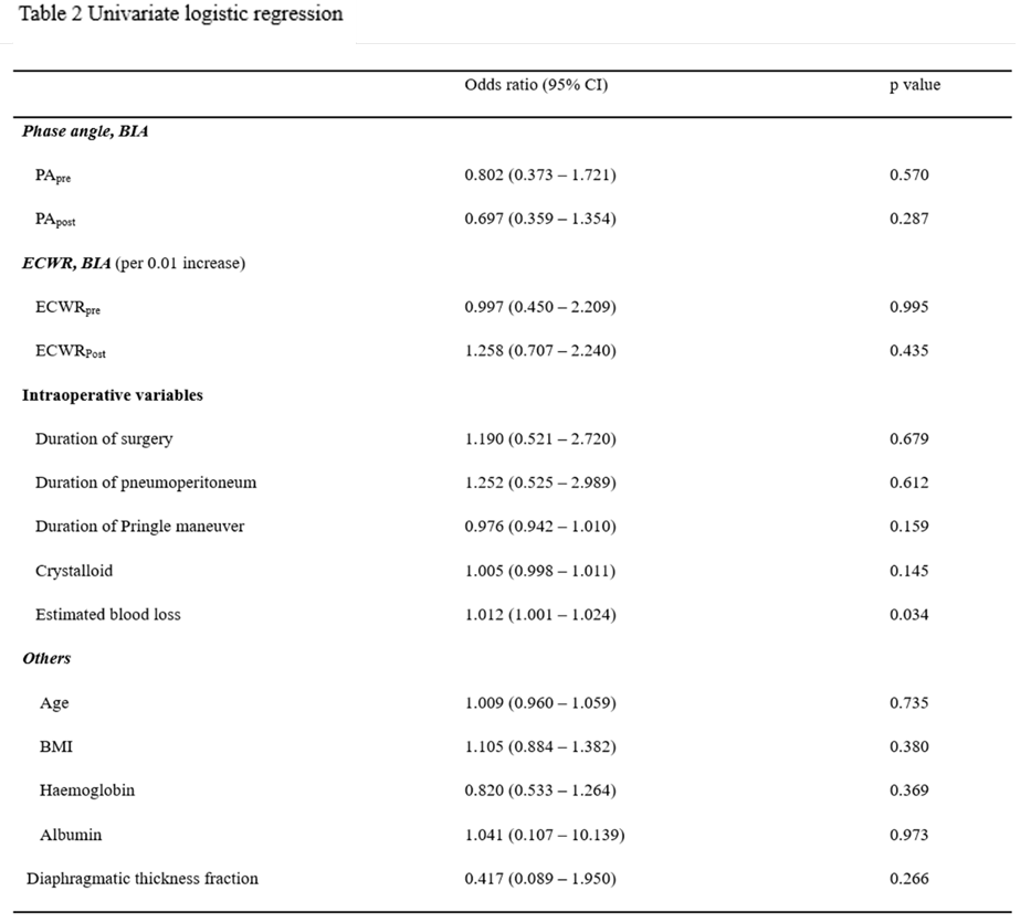 Results: The median age of participants was 35 years [27, 49], with 21 (48%) patients being male. Nearly half of the patients experienced one or more postoperative complications during their hospital stay. Baseline characteristics and preoperative BIA data according to variables included in in-hospital complications are presented in Table 1. There were no significant differences in baseline characteristics and PA between patients with or without complications, except for estimated blood loss during surgery. Logistic regression analysis (Table 2) was performed to assess the association of perioperative variables with postoperative complications, including age, BMI, laboratory results (hemoglobin, albumin, and creatinine), intraoperative variables (duration of surgery, pneumoperitoneum, pringle maneuver, crystalloid infusion, and estimated blood loss), and BIA (PA and extracellular water ratio). However, no significant risk factors were identified to predict postoperative complications.
