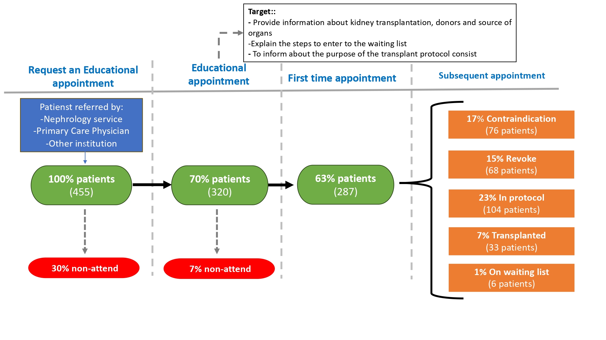 Results: From January 2022 to December 2023, we evaluated patients referred to begin kidney transplant protocol at the General Hospital of Mexico. A total of 455 (100%) requested educational appointment (informative talk about kidney transplantation). Only 70% continue with it and 63% follow the evaluation to the first-time appointment. (Fig 1.).
