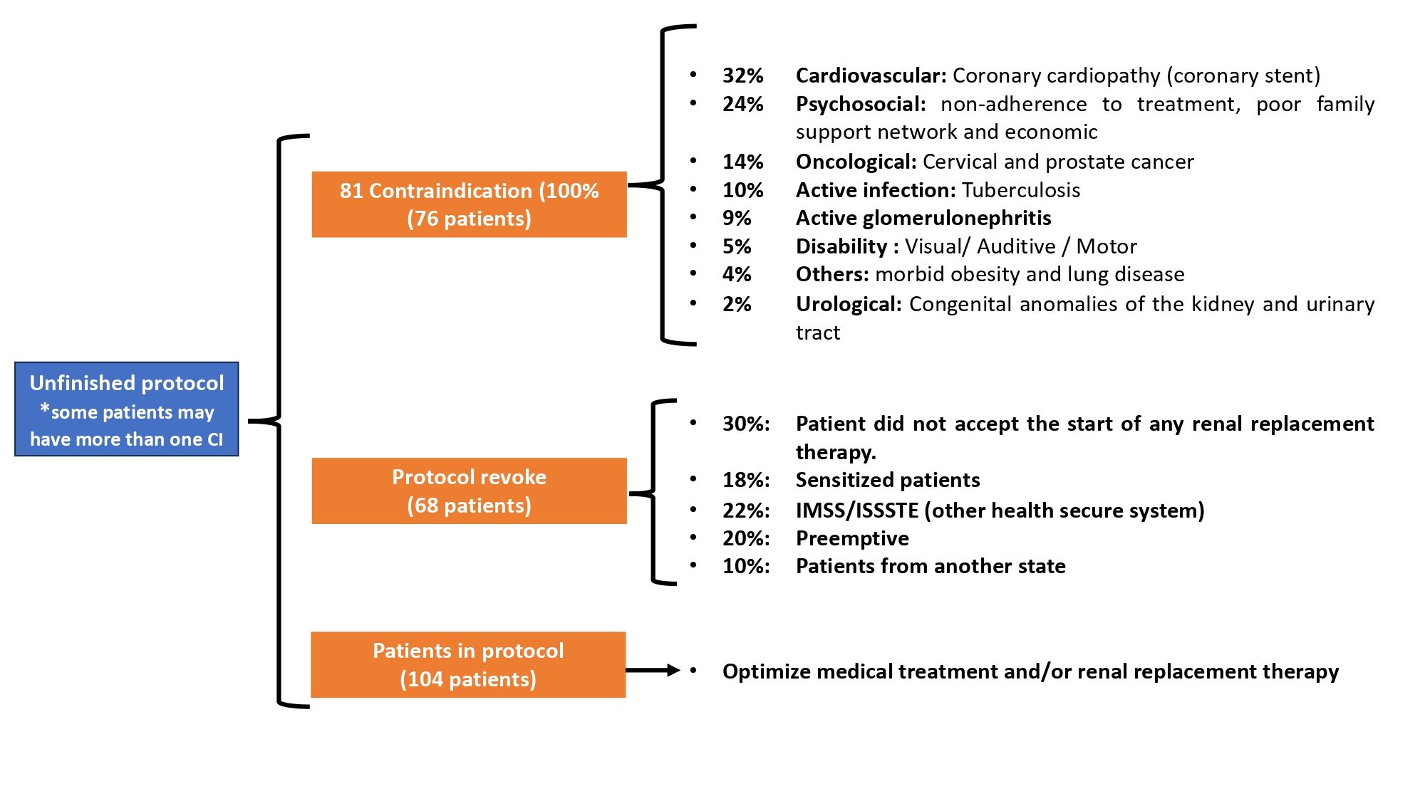 Fifty-five percent were men, with a mean age of 41± 14 years. The median time of diagnosis of chronic kidney disease (CKD) KDIGO 5 was 36 months (IQR 12 -72). The etiology of CKD was unknown in 61%, diabetes mellitus in 19%, glomerulonephritis in 11%, and others in 9% (kidney stones, polycystic disease, preeclampsia). We found that 61% patients were on hemodialysis, 21% on peritoneal dialysis, and 18% haven´t began any renal replacement therapy (RRT). The median time on RRT was 24 months (IQR 12-36). During the evaluation, 17% presented a medical contraindication, a total of 81 (100%): 32% cardiovascular (patients with coronary heart disease and decompensated heart failure), 24% psychosocial, 14% oncological, 10% active infection, 9% active glomerulonephritis, 5% disability, 2% urological, 4% others (morbid obesity and lung disease). Twenty five percent of the patients just attended once (sensitized patients, pre-dialysis patients, with social security and patients who did not accept the start of any renal replacement therapy), and 23% continue to be followed up and were listed. (Fig 2.)