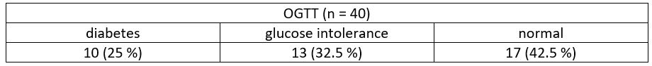 Results: Diabetes was basic kidney disease in 8 % of 100 eligible patients and for another 3 % diabetes was diagnosed before workup for TX. OGTT was done in 40 of 89 patients, without previously diagnosed diabetes. In 10 of the 40 patients OGTT showed diabetes (25 %) and glucose intolerance in another 13 (32.5 %), Table 1. Five patients with pathological pretransplantation OGTT developed NODAT (12.5 %), while no one with normal OGTT finding.