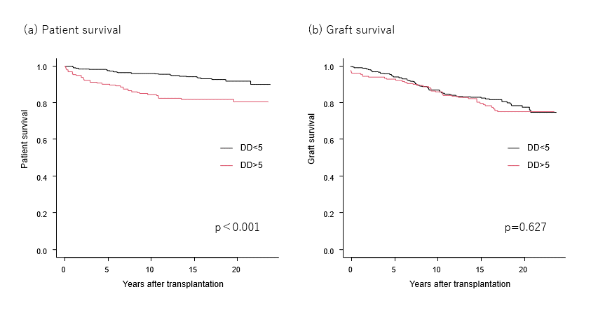 Results: The 5- and 10-year patient survival rates for DDb2010<5 and DDb2010>5 was 97.2% and 95.5%, 89.6% and 83.5%, respectively, with significantly higher in the DDb2010<5 group (p<0.001). There was no significant difference in death-censored graft survival rates between the two groups (p=0.764). After matching for patient background, survival was still significantly higher in the DDb2010<5 group (p=0.03). Factors affecting patient survival in univariate and multivariate analysis included recipient age, malignancy, and duration of dialysis prior to transplantation. The 5- and 10-year patient survival rates for the DDa2010<5 and DDa2010>5 groups were 97.2%, 94.5% and 95.4%, 89 .8%, and similarly, the DDa2010<5 group had significantly higher survival rates (p=0.02). However, there was no significant difference between the two groups after matching (p=0.461). Death-censored graft survival rates were not significantly different between the two groups both before and after matching. Duration of dialysis was not the factor to affect patient survival in multivariate analysis. The incidence of cardiovascular and other events after transplantation tended to be lower in the DDa2010 group than in the DDb2010 group.