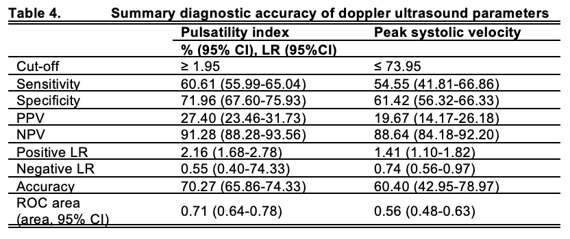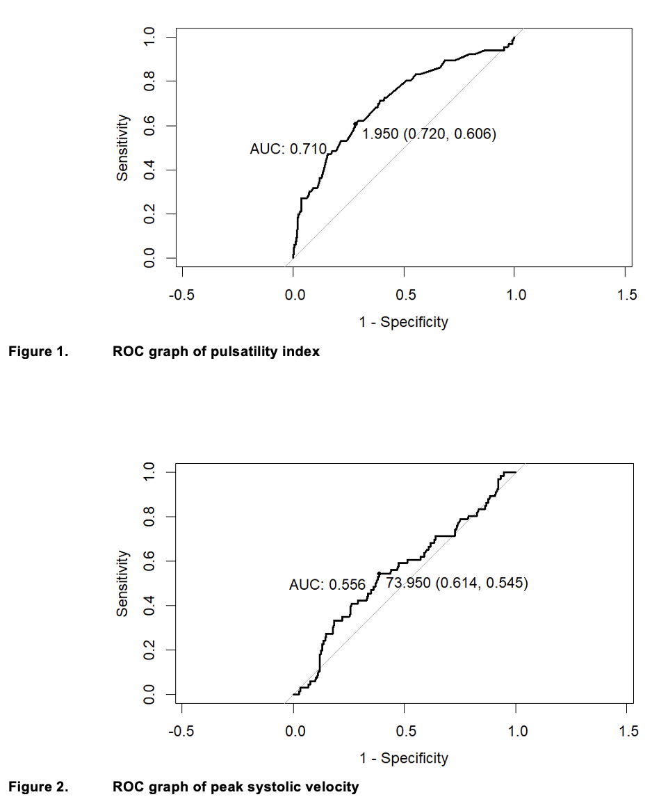 Results: 450 patients were included.  67 developed early graft dysfunction. Among the doppler ultrasound parameters analyzed, pulsatility index, with a cut-off of ≥ 1.95, revealed a sensitivity of 60.61% and specificity of 71.96%.  The receiver operating characteristic area for the pulsatility index was 0.71, indicating a good discriminatory capacity.  Peak systolic velocity, using a cut-off of ≤ 73.95, manifested a sensitivity of 54.55% and specificity of 61.42%. Its ROC area of 0.56 suggests moderate discriminating power. Overall, the pulsatility index appears to be a stronger diagnostic tool for early graft dysfunction.