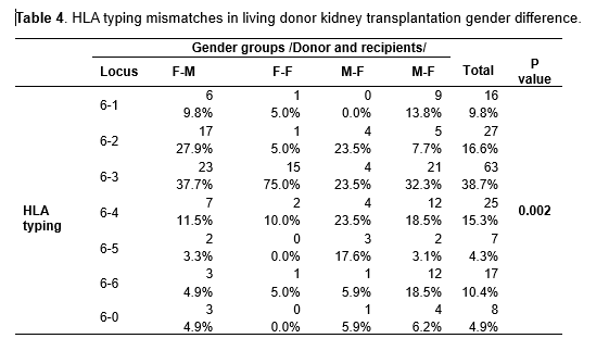 Regarding HLA typing miss much by 6 locus, 38.7% (63) of total recipients had 3 locules miss much. In all gender groups, majority percent of HLA typing was 6-3 locus, but, in F-F group, 6-3 locus HLA matching was higher than other groups (P=0.002).