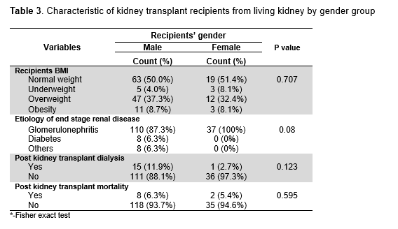 Result: Respectively, mothers was more donated her kidney to child than other groups. The majority of living kidney donors were female, with over 8 (40.0%) patients with the parental relationship were mother and 3 (17.6%) patients were from fathers. On the other hand, in male recipients, 9 (52.9%) recipients received from sisters and 31 (47,7%) recipients received from brothers (P>0.05). In terms of donor employment and religion, there was no statistically significant difference among gender groups. In all gender groups, except F-F group, overweight donor consisted more than half of total donors (P>0.05). Men were more likely to have diabetes than women (P>0.05). 11.9% (15) of male recipients underwent RRT, whereas, 2.7% (1) of female recipients had RRT (P>0.05). During the study period, 6.3% (8) of male recipients passed away, which is slightly higher percent than female group (P>0.05).