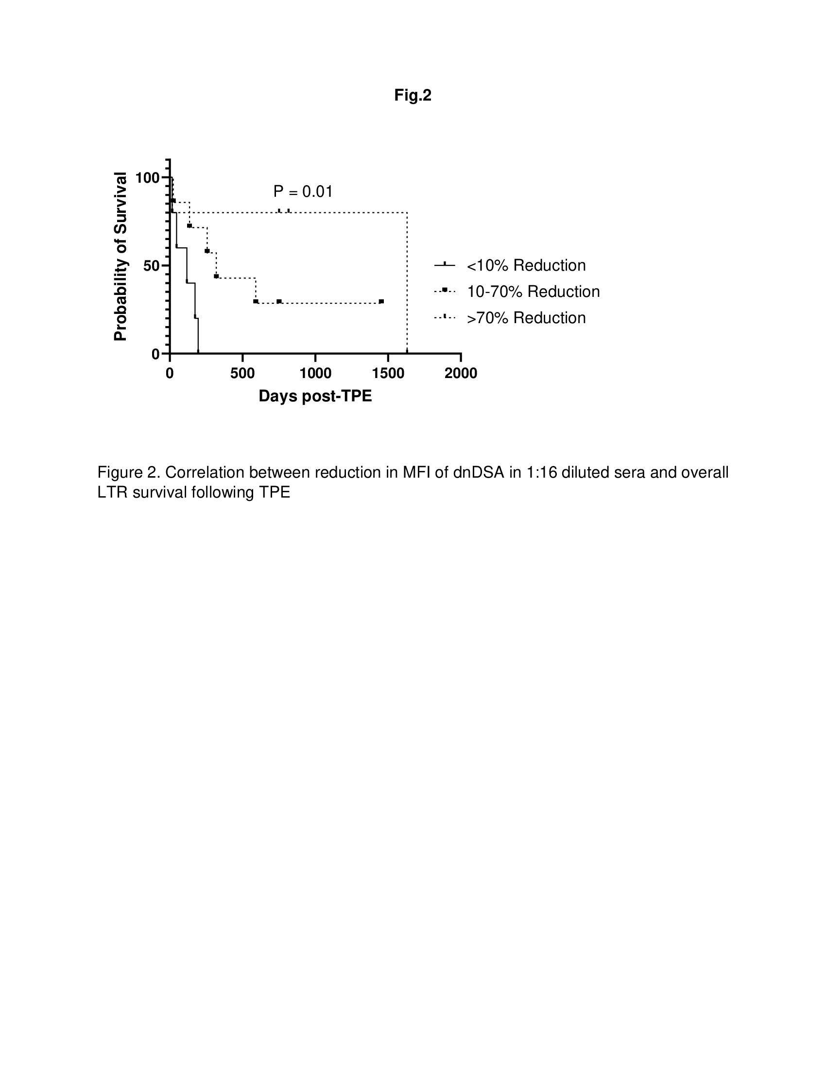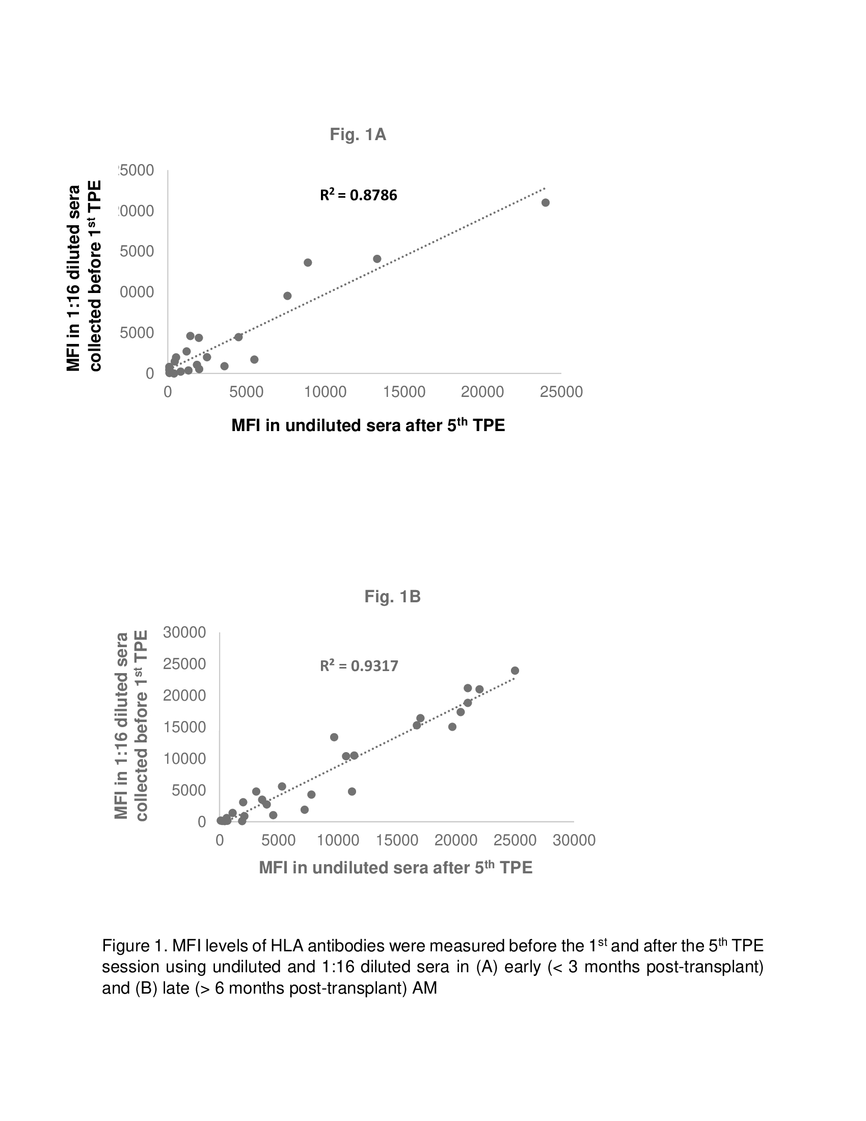 Results: Of 21 patients, 9 and 12 patients were diagnosed with early (< 3 months post-transplant) and late (6 months – 3 years post-transplant) AMR respectively. All patients had Class II dnDSA. In addition, 55% and 16% of LTR with early AMR and late AMR, respectively also had class I dnDSA. The MFI for all positive dnDSA in 1:16 diluted sera collected before 1st TPE demonstrated a significant correlation with MFI in undiluted sera collected 1 day after 5th TPE in both early (Fig. 1A; R2 = 0.8786) and late (Fig. 1B; R2 = 0.9045) AMR post-transplant. In addition, reduction in MFI of dnDSA in 1:16 diluted sera correlated with better overall LTR survival following TPE (Fig, 2; p = 0.01).