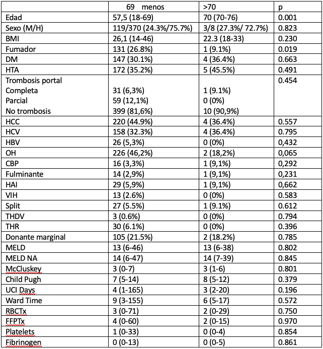 Results: Preoperative prognostic scales are significantly more favorable in the older age group. Younger recipients have presented fewer comorbidities, but smoking habits have been significantly more frequent. We found no significant differences in etiology between the groups. The percentage of smokers was 131 (27.4% in <70 years) vs. 1 (9.1% >70 years), p=0.019. Portal thrombosis rates were similar between the groups. Donor characteristics were similar in both groups. Recipients older than 70 years had a higher mortality rate due to a higher incidence of early post-transplant complications. Actuarial survival of older recipients was statistically inferior to that of those under 70 years, at 1.3 and 5 years: 89.3%, 84.8%, and 82.5% in <70 years vs. 72.7%, 48.5%, and 48.5% in <70 years (p=0.008). Causes of mortality are similar but earlier and more frequent in the older age group, with the recipient's age being statistically significant in multivariate analysis.