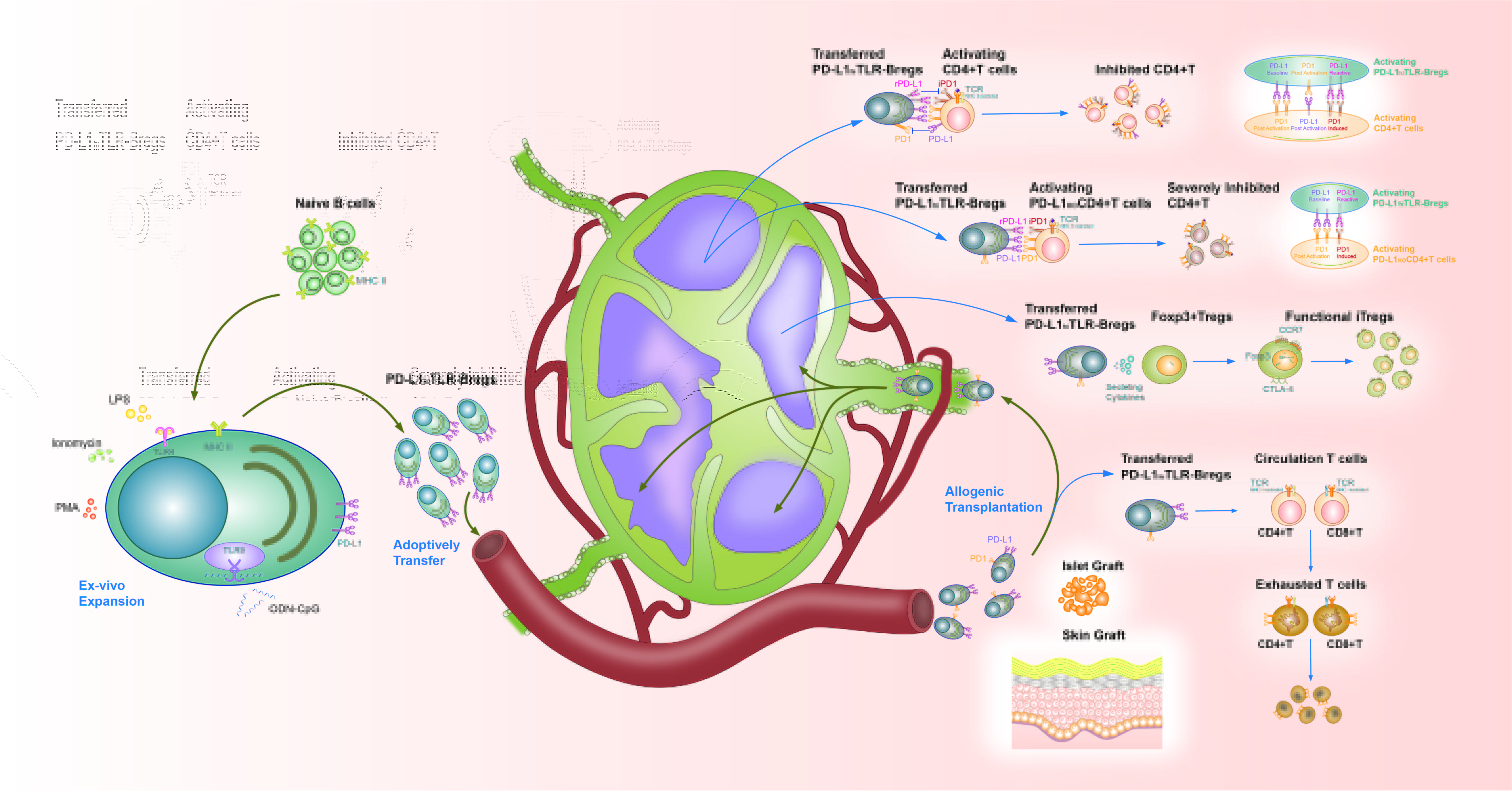 Conclusion: High PDL1 expression on TLR-Bregs is foundational to their regulatory function. PDL1 deficiency in TLR-Bregs impairs their ability to suppress CD4+T cell activation, promotes T cell exhaustion, induces functional iTregs, and prevents the antagonistic effects of activated PDL1hiCD4+T cells. Conversely, PDL1 deficiency on CD4+T enhances Bregs' regulatory capacity. This study underscores the therapeutic potential of targeting the PDL1-PD1 pathway on Bregs in enhancing allograft tolerance.