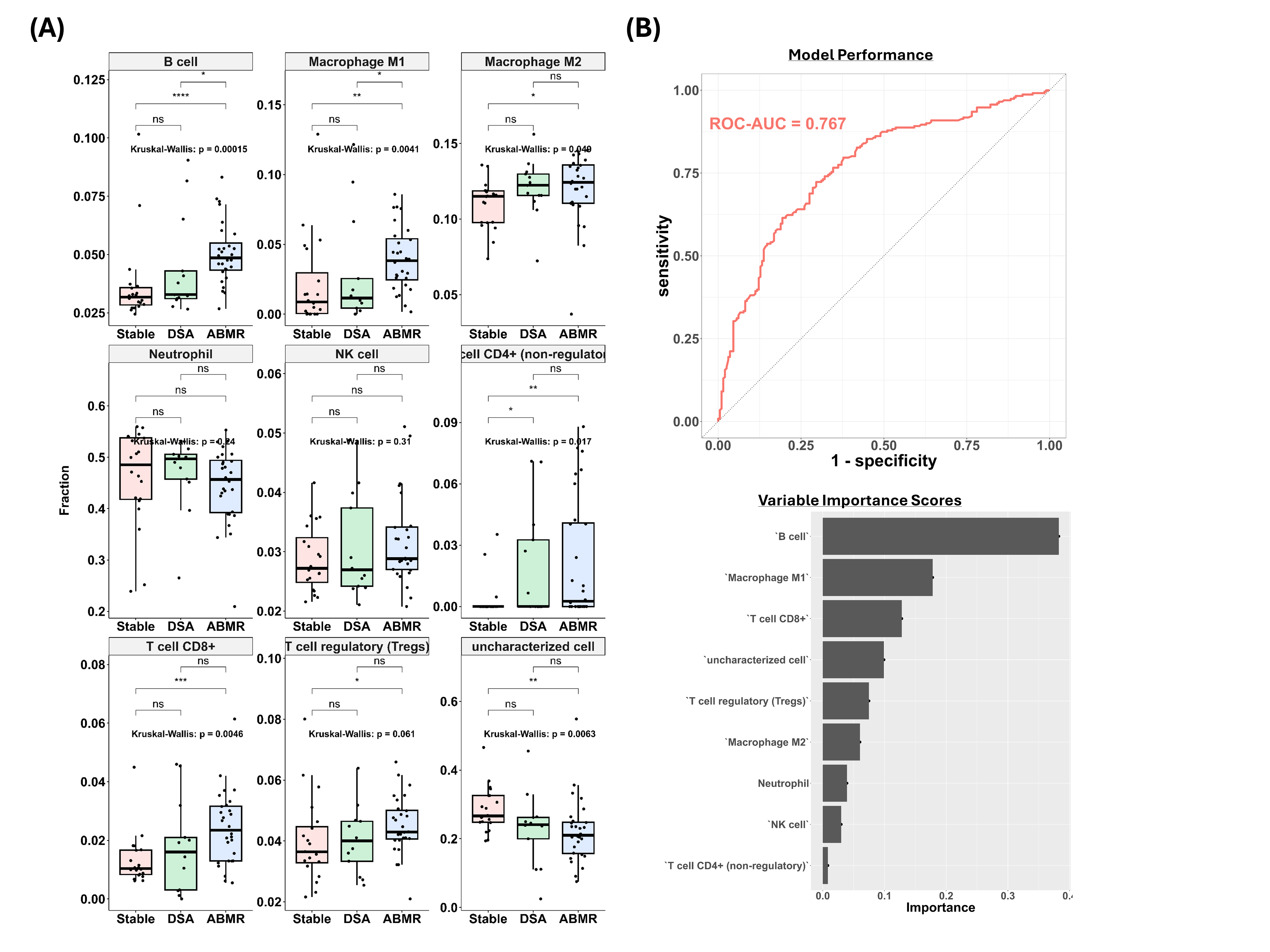 Results: Immune cell infiltration analysis revealed that compared to the DSA(-) control, B cells, macrophages, and a subset of T cells were upregulated in the ABMR group (Figure A). Furthermore, the differentiating factors between DSA(+)/ABMR(-) and DSA(+)/ABMR(+) groups were B cells and macrophage M1. When XGBoost models were trained on selected immune-cell types, the best-performing model exhibited an area under the receiver operating characteristic curve of 0.767. The model also calculated variable importance (VI) scores for input features, identifying B cells (VI = 0.352) as the most significant feature, followed by macrophage M1 (VI = 0.192) and CD8+ T cells (VI = 0.131).