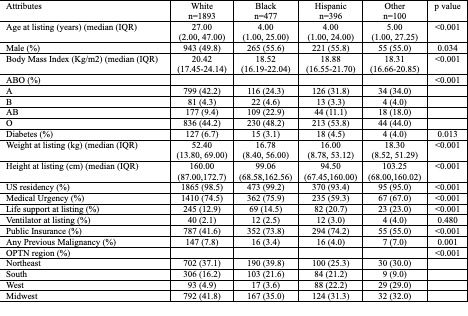 Results: The patients with full data set included 66% White, 16.6% Black, 13.8% Hispanic, and 0.03% of other background. Males (55%) outnumbered females (45%) among all ethnic groups except whites (49.8%). Mean age at listing for white patients was higher than other ethnic groups (p=0.01), and white patients had higher BMI (20.42) and comprised more diabetics and patients with malignancies compared to other ethnic groups (p<0.001). Black patients had higher medical urgency than other ethnic groups (p<0.001), while more Black and Hispanic patients had public health insurance (p<0.001) (Fig. 1).