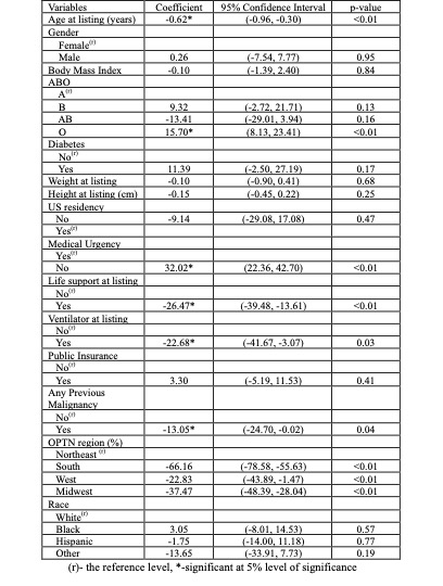 Methods: Out of the 5615 cases archived between Oct 1991 to Sept 2023 by OPTN, we excluded 2,749 cases because of data insufficiency. Sex, age, body mass index, health conditions at the listing, insurance situation, and regional distribution for the remaining 2866 patients were analyzed. Since the output variable (i.e., waiting time) was non-normal, the Kurskal-Wallis test with Bonferroni correction and a rank-based regression model were applied to investigate the equality of median days in the waiting list. Pairwise comparison on medium waiting was analyzed using the Wilcoxon-Rank-sum test. A non-parametric bootstrap method was used to construct a 95% confidence interval to reduce the effect of outliers on regression coefficient and hypothesis testing.