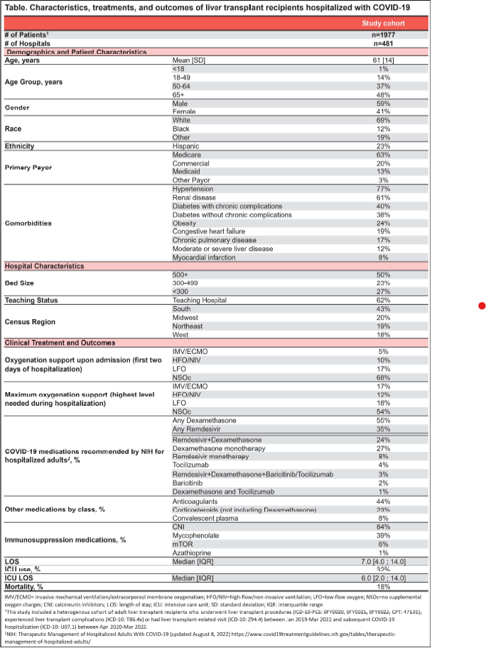 Results: 1,977 liver transplant recipients were hospitalized for COVID-19 in 481 hospitals of varying size, type, and location (Table). The average age was 61 years (S0=14), 59% male, 69% white, and 23% Hispanic. Key recorded comorbidities included: 77% hypertension, 61 % renal disease, 40% diabetes with chronic complications, and 38% diabetes without chronic complications.