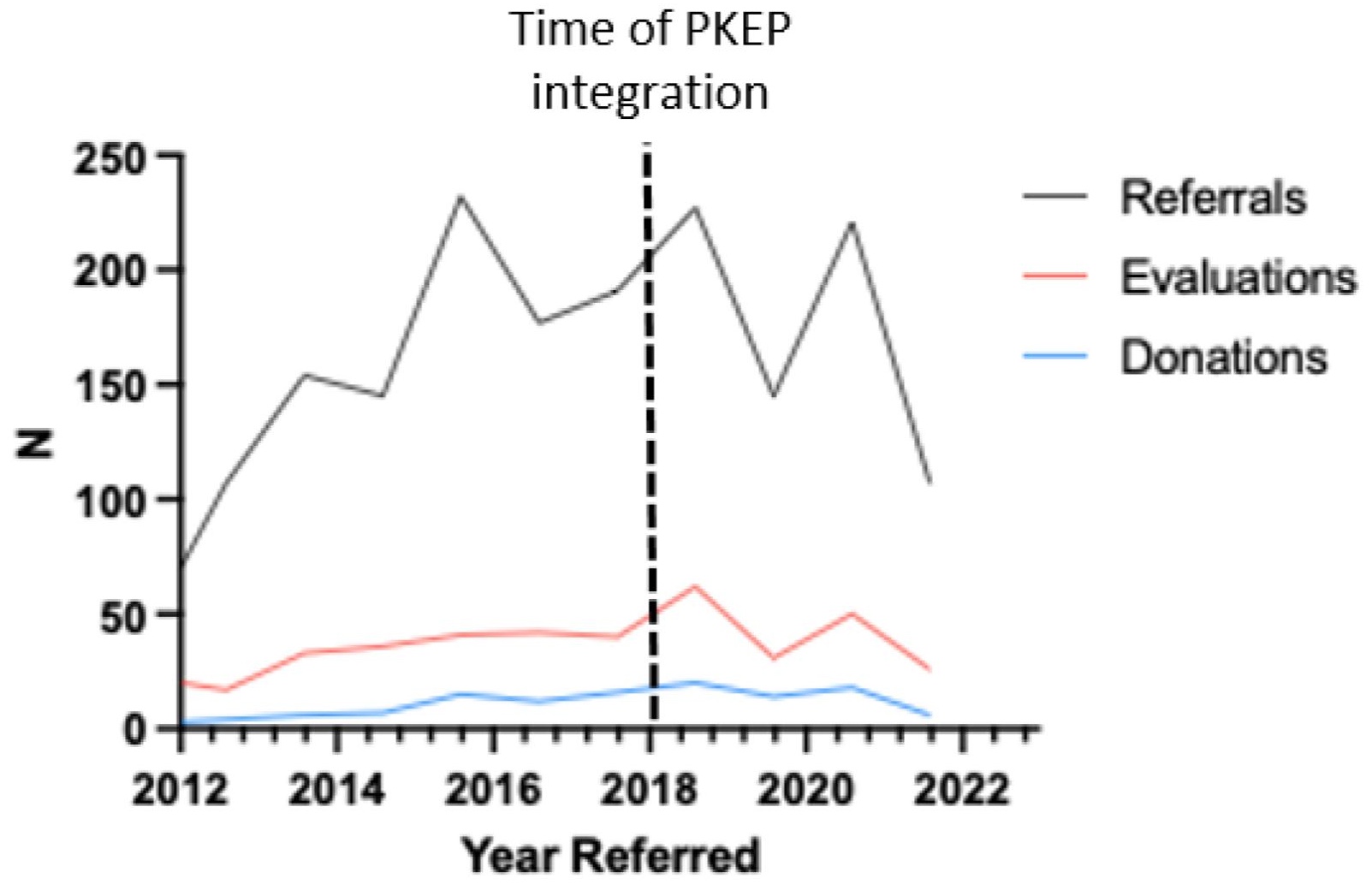 Methods: Retrospective review and analysis of 1,776 individuals referred, evaluated, and donated at our transplant center over a 10-year period (June 1,2012–May 31,2022) were conducted. PKEP-affiliation began on Feb 1,2018, and comparative analysis was performed for pre-PKEP and post-PKEP phases.
