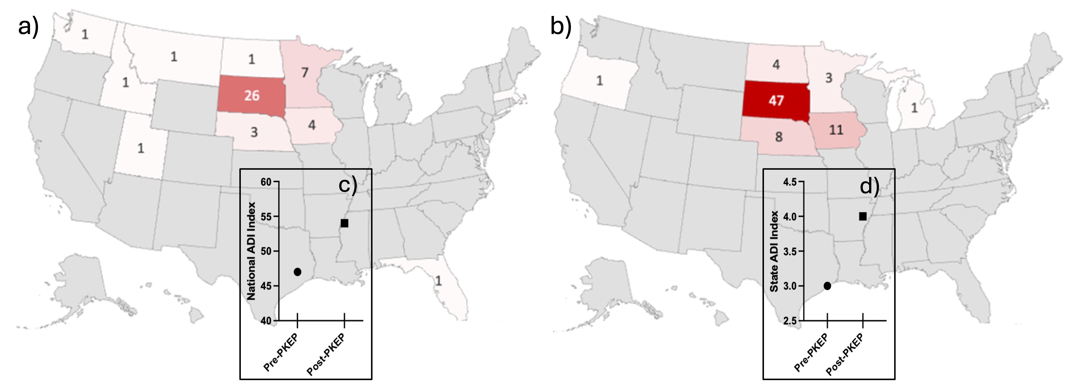 Results: In contrast to pre-PKEP (5 2⁄3 years), there were increased total referrals, evaluations, and donations post-PKEP (4 1⁄3 years) with a significant increase in referral-to-donation conversion (p=0.008, Figure 1). PKEP-affiliation enabled higher retention of in-state donors and appealed to those from neighboring states lacking PKEP-affiliated centers (Figure 2a & 2b). During both phases, individuals who were in a relationship, lived with cohabitants, attained higher education (Bachelor’s degree at minimum), employed, or had a dependent seemed more likely to donate, however, this was confounded by unspecified data within those categories from numerous pre-PKEP referrals. This said, compared to pre-PKEP, the post-PKEP phase demonstrated a larger proportion of donors from disadvantaged socioeconomic neighborhoods (median area deprivation indices 47 vs 54 [p=0.056; Figure 2c] nationally and 3 vs 4 [p=0.055; Figure 2d] at state levels, respectively) and rural counties (38% vs 50% [p=0.099], respectively). Post-PKEP, more women came forward (70% vs 60%, p=0.02) and donated (73% vs 66%, p=0.51); more Indigenous People donated (5 vs 2, p=0.72) despite reduction in referrals (67 vs 121, p=0.04); and a steep rise in non-directed referrals and donations transpired (13% vs 3%, p=0.01 and 12% vs 2%, p=0.04, respectively). While medical comorbidities and variant renal anatomy excluded the majority of donor candidates at evaluation in both phases, significantly more were lost to follow-up post-PKEP (44% vs 21% pre-PKEP, p<0.01) prior to evaluation. After evaluation, 32.7% of potential donors either self-retracted or had an unacceptable blood or tissue type in pre-PKEP phase compared to 25.1% of potential donors in post-PKEP phase (p=0.027) which included those who opted out of PKEP.