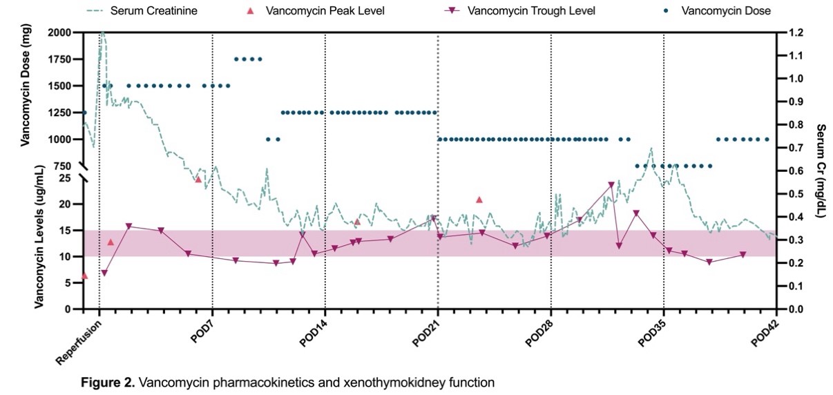 Conclusions: Tacrolimus PK in a decedent after xenothymokidney transplantation demonstrate variability likely due to absorption changes, diarrhea, and CYP3A4 drug interactions. MPA and MPAG AUCs were lower than expected possibly due to intermittent high dose corticosteroids, xenograft hyperfiltration, and other subject-specific factors. Vancomycin trough concentrations were maintained at goal, indicating effective excretion via glomerular filtration without any evidence of vancomycin-induced kidney injury or nephrotoxicity. Further research is necessary to characterize the PK, optimize therapeutic concentrations, and define the optimal dose of immunosuppressive and other medications after xenotransplantation.