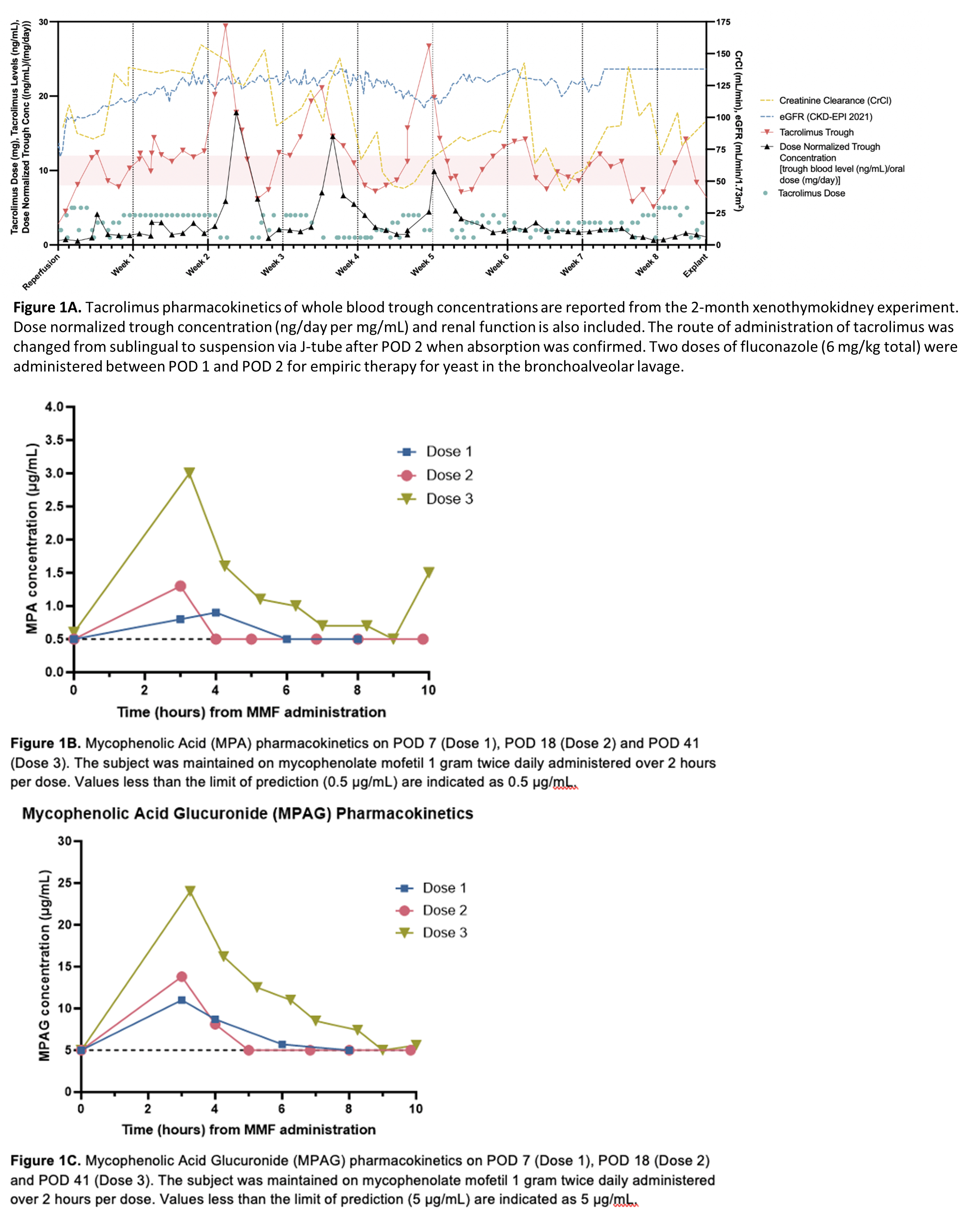 Methods: A nephrectomized decedent received a porcine xenothymokidney transplant and was observed for 61 days. A standard maintenance immunosuppressive regimen was used. Pharmacokinetics of IV MMF 2 grams/day over 2 hours and tacrolimus, sublingual and suspension via jejunostomy tube, were calculated. Daily whole blood trough concentrations were drawn for tacrolimus. PK of MMF were obtained on POD 7 (Dose 1), 18 (Dose 2) and 41 (Dose 3). The decedent was maintained on intravenous vancomycin for skin/soft tissue infection prophylaxis, with trough concentrations analyzed every 48 to 72 hours or if there was a change in renal function.