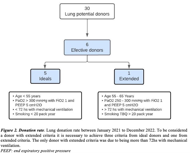 Results: The sample consisted of 30 potential lung donors admitted to the intensive care unit, comprising 21 (70%) males. The mean age was 38.3 years (SD 12.46). Regarding mechanical ventilation variables, PDs were ventilated between 6 and 8 ml/kg with a mean of 6.93 (SD 0.96), RR 19.13 (SD 3.31), Ppl 17.13 (SD 2.43), DP 9.07 (SD 1.96); with respect to MV days, a median of 2 (IQR 2-3) was observed. Oxygenation variables showed a mean PaO2/FiO2 of 372.38 (SD 66.73) and a/A of 0.64 (SD 0.13). The reported organ donation rate was 100% (n=30), while 20% (n=6) were effective lung donors, of which five were ideal donors and one was a marginal donor.