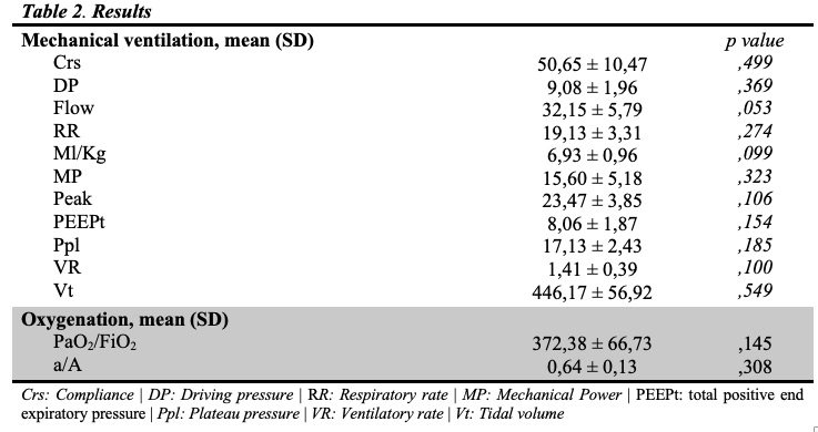 Methods: Retrospective, cross-sectional, observational study design. Potential lung donor patients with BD certification admitted to Hospital de Alta Complejidad del Bicentenario Esteban Echeverria from January 2021 to December 2022 were included. Ventilatory variables: ventilatory mode, tidal volume, respiratory rate, positive end-expiratory pressure, flow, plateau pressure, peak pressure, static compliance, resistance, driving pressure, mechanical power, and ventilatory ratio. Oxygenation variables: arterial oxygen pressure/inspired oxygen fraction (PaO2/FiO2) ratio and arterioalveolar ratio (a/A).