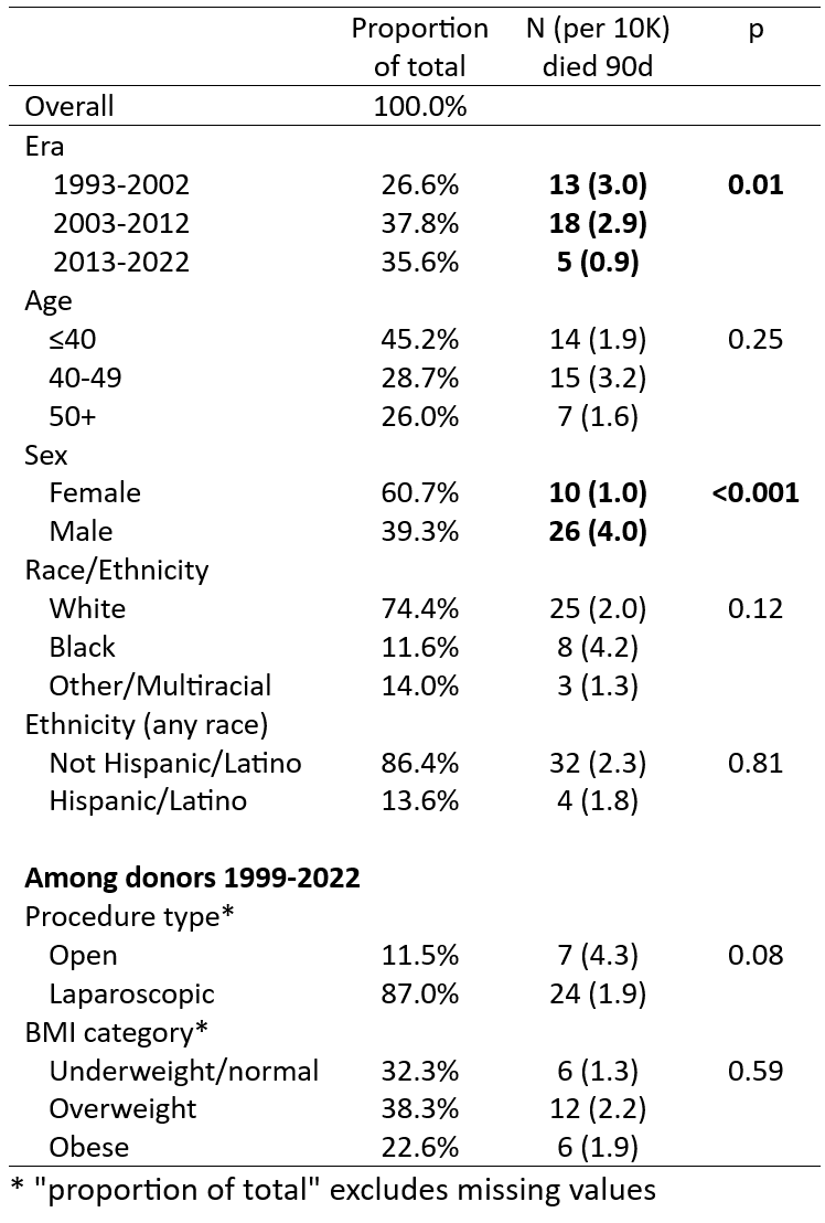 Methods: Using United States national registry data (SRTR) on 164,564 LKDs 1993-2022, we calculated rates of mortality within 90 days of donation, stratified across three eras: 1993-2002, 2003-2012, and 2013-2022. Death events were captured from living donor follow-up reported by transplant programs as well as external sources. We compared risk across eras, and across subgroups of LKDs using Fisher exact tests. Subgroups by procedure type and BMI category were analyzed for LKDs 1999-2022 when these variables were reliably captured in the registry.  Due to the small number of events, we did not conduct multivariable analyses.
