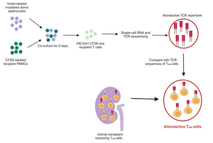 Methods: Alloreactive T-cell receptors (TCRs) were identified in pre-transplant blood samples through mixed lymphocyte reactions, followed by single-cell RNA and TCR sequencing (10x Genomics) of the proliferated recipient T cells. Subsequently, these TCR clones were traced in the TRM cells of kidney explants, which were also subjected to single-cell RNA and TCR sequencing (10x Genomics).