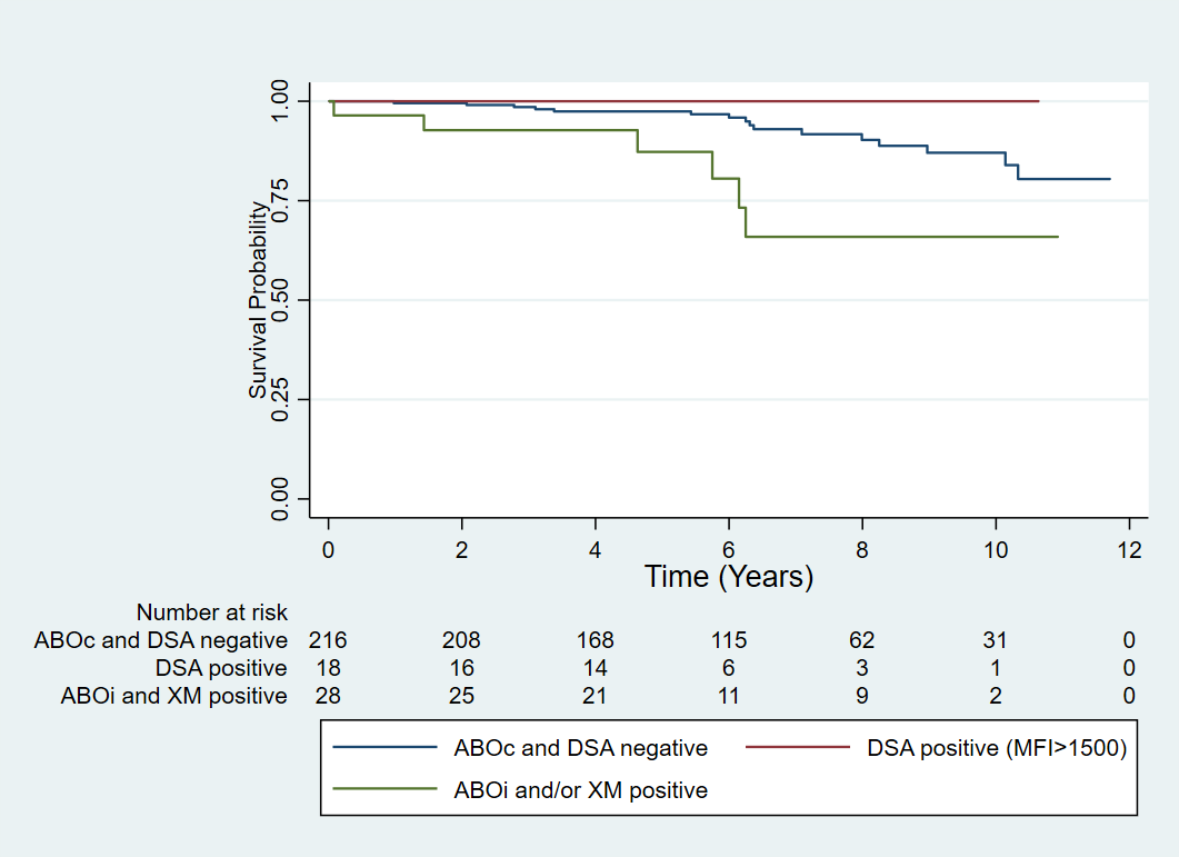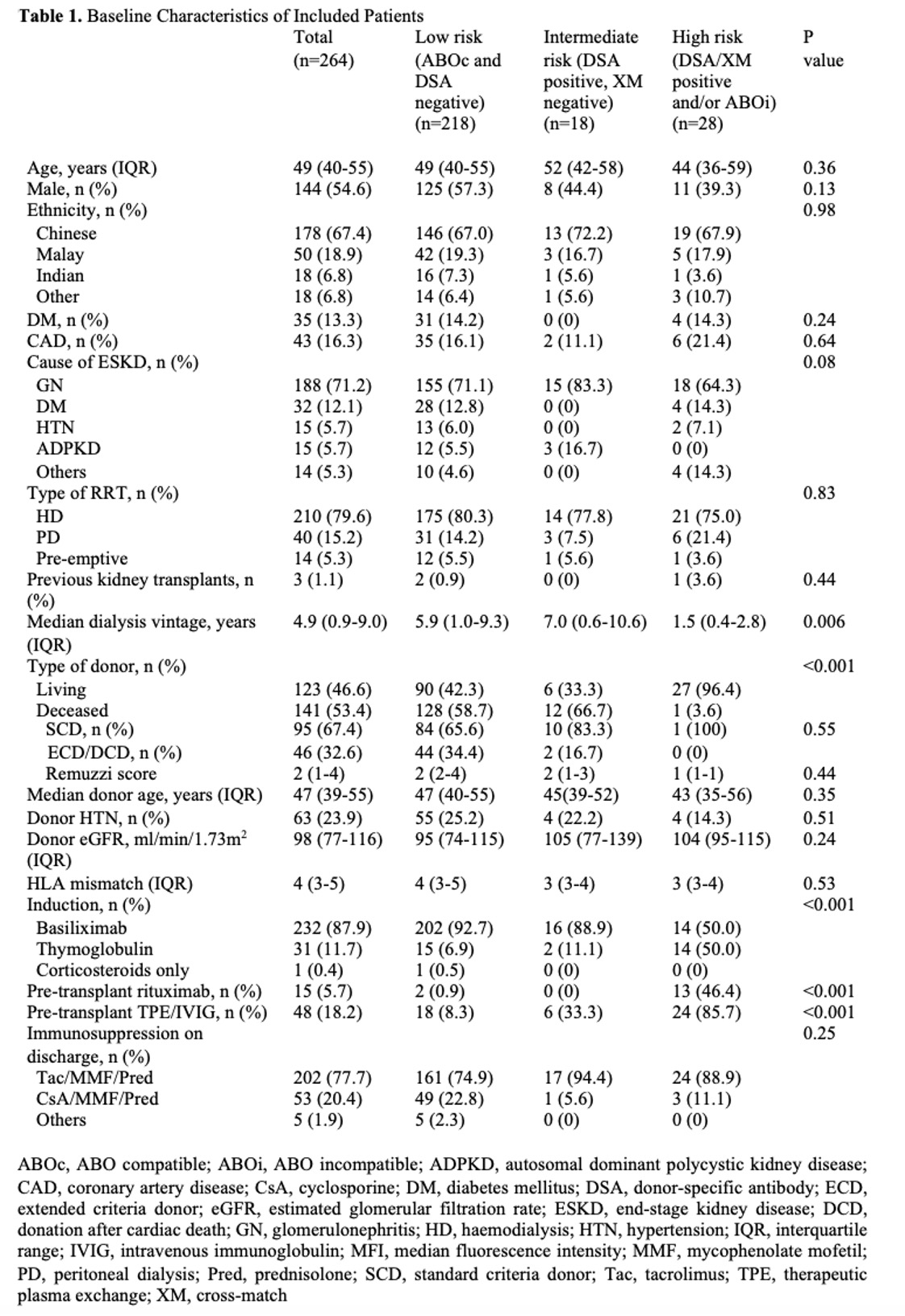 Method: A retrospective chart review of adult KTs performed between January 2012 to May 2021 was conducted. High immunological risk was defined as KTs that were ABO incompatible or complement-dependent cytotoxicity (CDCXM) or flow cross-match (FXM) positive with donor-specific antibodies (DSA), intermediate risk as those who had immunodominant DSA of median fluorescence intensity (MFI) ≥ 1500 but were CDCXM and FXM negative, and low risk as those who were ABO compatible and DSA negative.