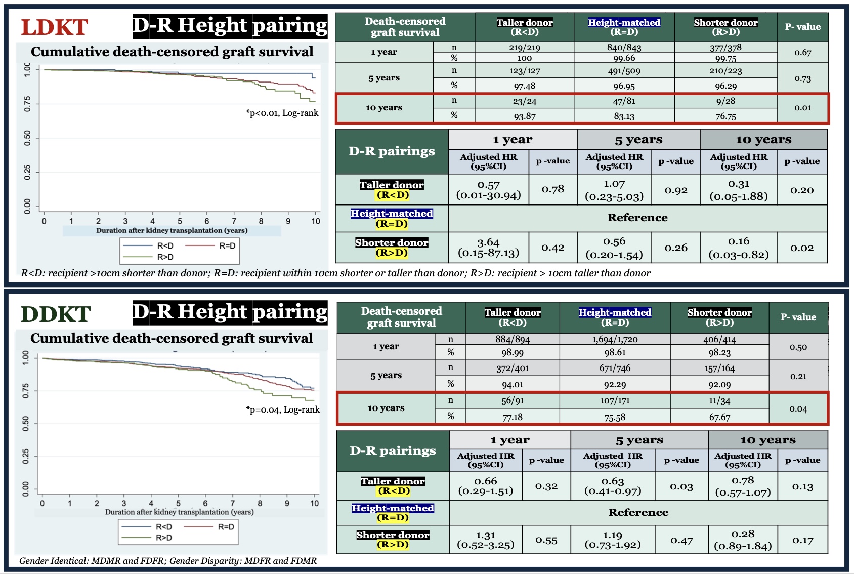 Results: The data revealed a total of 5,594 transplants, with 1,695 being LDKT and 3,899 being DDKT. Of these, the R<D group exhibited the highest 10-year DCGS following LDKT (R<D: 93.87%, R=D: 83.13% and R>D: 76.75%; p=0.01) and DDKT (R<D: 77.18%, R=D: 75.58% and R>D: 67.67%; p=0.04). We also found superior 5-year patient survival among gender disparity group following DDKT (92.79% vs 90.47%; p=0.04). However, after adjusting for covariates, multivariate Cox regression analyses revealed no significant association.