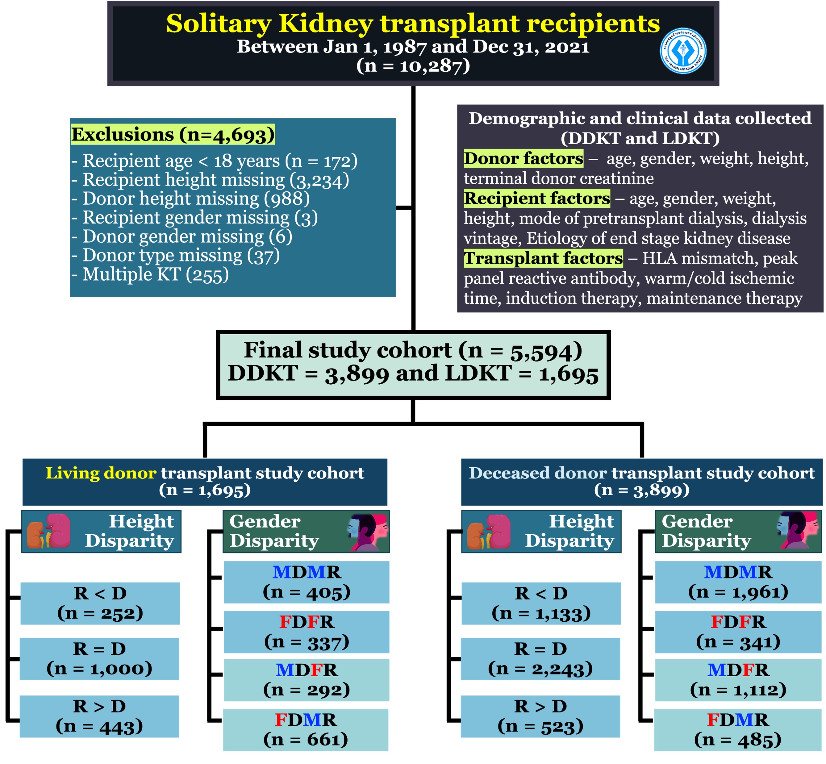 Method: We conducted a retrospective cohort study using data from the Thai Transplant Registry. Adult patients ≥18 years underwent living and deceased donor kidney transplantation (LDKT and DDKT) between 1987 and 2021, with available R and D height data, were included. We categorized D-R height pairings into 3 groups based on a 10-centimeter (cm) height difference (recipient ≥10cm taller than donor [R>D], recipient within 10cm shorter or taller than donor [R=D] and recipient ≥10cm shorter than donor [R<D]), and gender pairings into gender identical and gender disparity. The primary outcome was 1-year, 5-year, and 10-year death-censored graft survival (DCGS). Secondary outcome was overall patient survival following KT. Demographic data were analyzed using Chi-squared test, Fischer's exact test, and analysis of variance (ANOVA). Outcome measures were investigated using Kaplan–Meier survival analysis and the Cox proportional hazard model. Firth penalized Cox regression was also implemented. This study was approved by Rajavithi Hospital ethics committee.