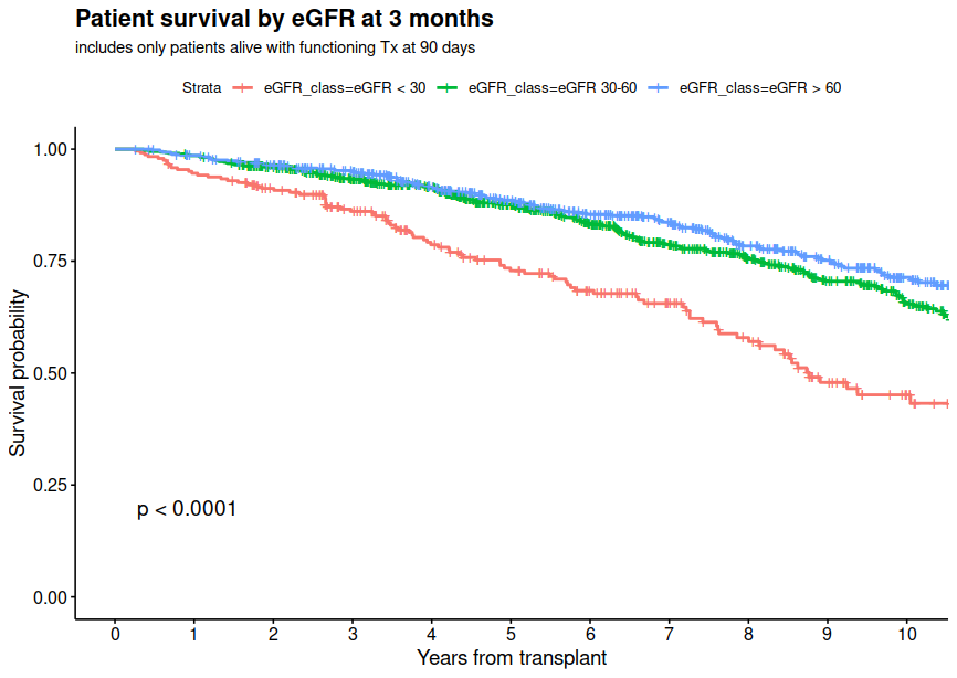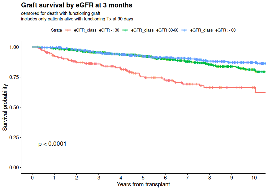 Results:  Graft survival censored for death with functioning graft, was found to be lower in patients with eGFR <30 at 3 months, with 5- and 10-year graft survival of 75.2% and 66.3%, compared with 92.3% and 81.0% in the eGFR 30-60 group; and 92.5% and 87.4% in the eGFR >60 group (Logrank p<0.0001).