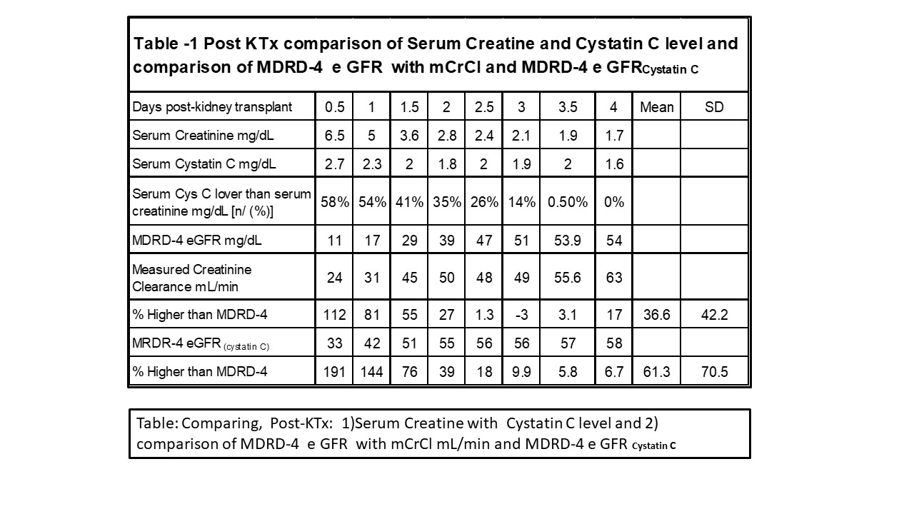 Post-kidney transplant (KTx) with primary allograft function, comparison of Serum creatinine with Serum Cystatin-C, and measured urinary creatinine clearance (mCrCl) with MDRD-4 eGFR and MDRD-4 eGFR eGFRCysC