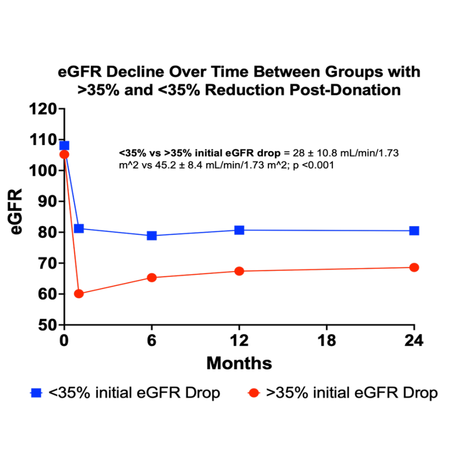 Results: Our cohort comprised seven hundred ninety-one donors and four hundred and ninety-six continued follow-up at 24 months. The study population included 62.8% females, 34% Caucasian, 19.6% African Americans, 43.8% Hispanics, and 2.5% from other racial groups. Mean eGFR ± SD reductions at 12 and 24 months were 33.2 ± 12.8 mL/min/1.73 m^2 and 32.5 ± 12.8 mL/min/1.73 m^2, respectively. No significant association was observed between >35% eGFR decline and evaluated variables: age over 50, gender, race, smoking status, hypertension, BMI >30, kidney biopsy with >10% glomerulosclerosis, or pre-donation eGFR. Nonetheless, initial eGFR decrease greater than 35% in the 2–4-week post-donation phase significantly predicted a persistent decline at 12 and 24 months, with mean drops of 45.2 ± 8.4 mL/min/1.73 m^2 compared to a 28 ± 10.8 mL/min/1.73 m^2 for those with greater than and less than a 35% drop, respectively (Figure 1) (p <0.001).