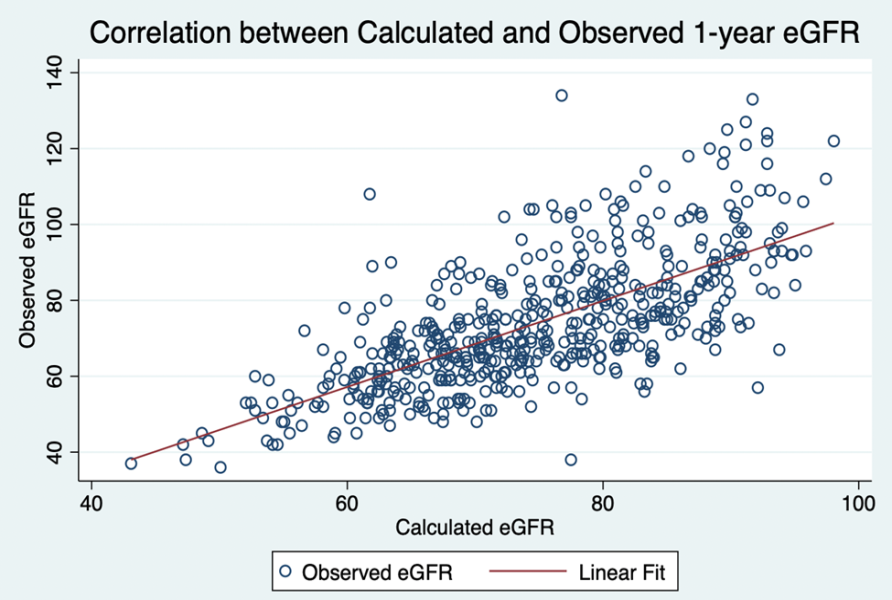 Methods: We retrospectively reviewed the clinical data of seven hundred ninety-one donors who underwent nephrectomy for living donor kidney transplantation at the Miami Transplant Institute from 2011 to 2021. The observed eGFR calculated with the 2021 CKD-EPI formula one year after donation was evaluated against the predictive model of eGFR determined using TRM at one-year post-donation to evaluate the predictive ability of the formula through descriptive statistics, Pearson correlation, and ROC curve analysis. Statistical significance was set at a p-value <0.05, with analyses performed using STATA/BE, version 17.