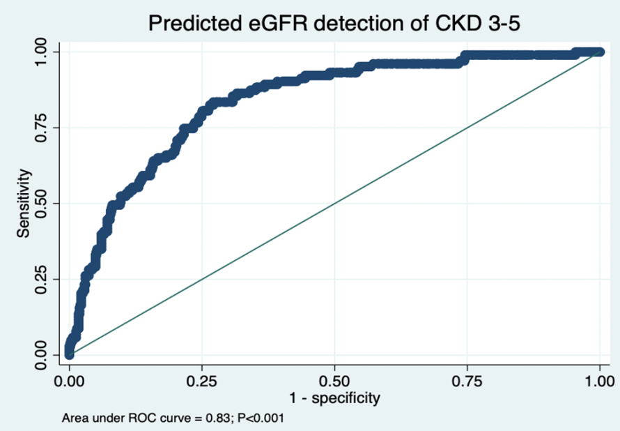 Results: Seven hundred ninety-one donors were included: 62.8% females, 34% Caucasian, 19.6% African Americans, 43.8% Hispanics, and 2.5% from other racial groups. A good correlation (Pearson r = 0.693; p < 0.001) was observed between predicted and observed 1-year post-donation eGFR (Figure 1). The area under the ROC curve (Figure 2) showed good discriminative ability of the formula in predicting observed CKD at 1-year post-donation (AUC = 0.83; p <0.001). Sensitivity and specificity for predicting CKD stages 3-5 were 21.4% and 89%, respectively.