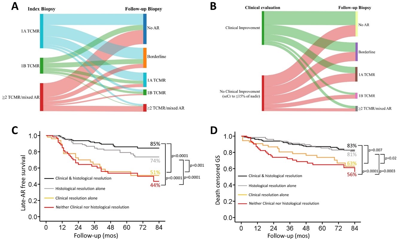 Results: We analyzed 8740 Bxs from 5316 KTPs, of whom 818 (15.4%) had TCMR (47% Banff 1A, 19% 1B, 34% ≥2/mixed TCMR/ABMR) in the 1st post-transplant year. Of these, 73% had at least one follow-up Bx within a year of TCMR diagnosis allowing assessment of histological resolution. Irrespective of TCMR-grade, only 47% of patients exhibited clinical improvement (seCr improvement to ≤15% of nadir) despite anti-rejection therapy. Similarly, only 39% of KTPs had complete histological TCMR-resolution (34% had partial resolution), whereas 27% had persistent TCMR at same/worse grade despite therapy (Fig 1A). Strikingly, TCMR was persistent in 35% of patiets with the mild-1A TCMR, suggesting that histological persistence was not related to rejection severity on index Bx. Only 24% of patients with clinical improvement demonstrated full histological resolution, while 27% had persistent TCMR despite clinical improvement. In contrast, 63% of patients without clinical improvement demonstrated either complete or partial histological resolution, suggesting a clinical-histological mismatch (Fig 1B). Irrespective of index-histological grade and independent of potential confounders, early histological persistence was associated with significantly worse 7-yr-late AR-free survival and 7-yr-death-censored graft survival. Lack of clinical resolution was associated with significantly worse late AR-free survival or graft survival only when there was early histological persistence of TCMR (Figs C&D).