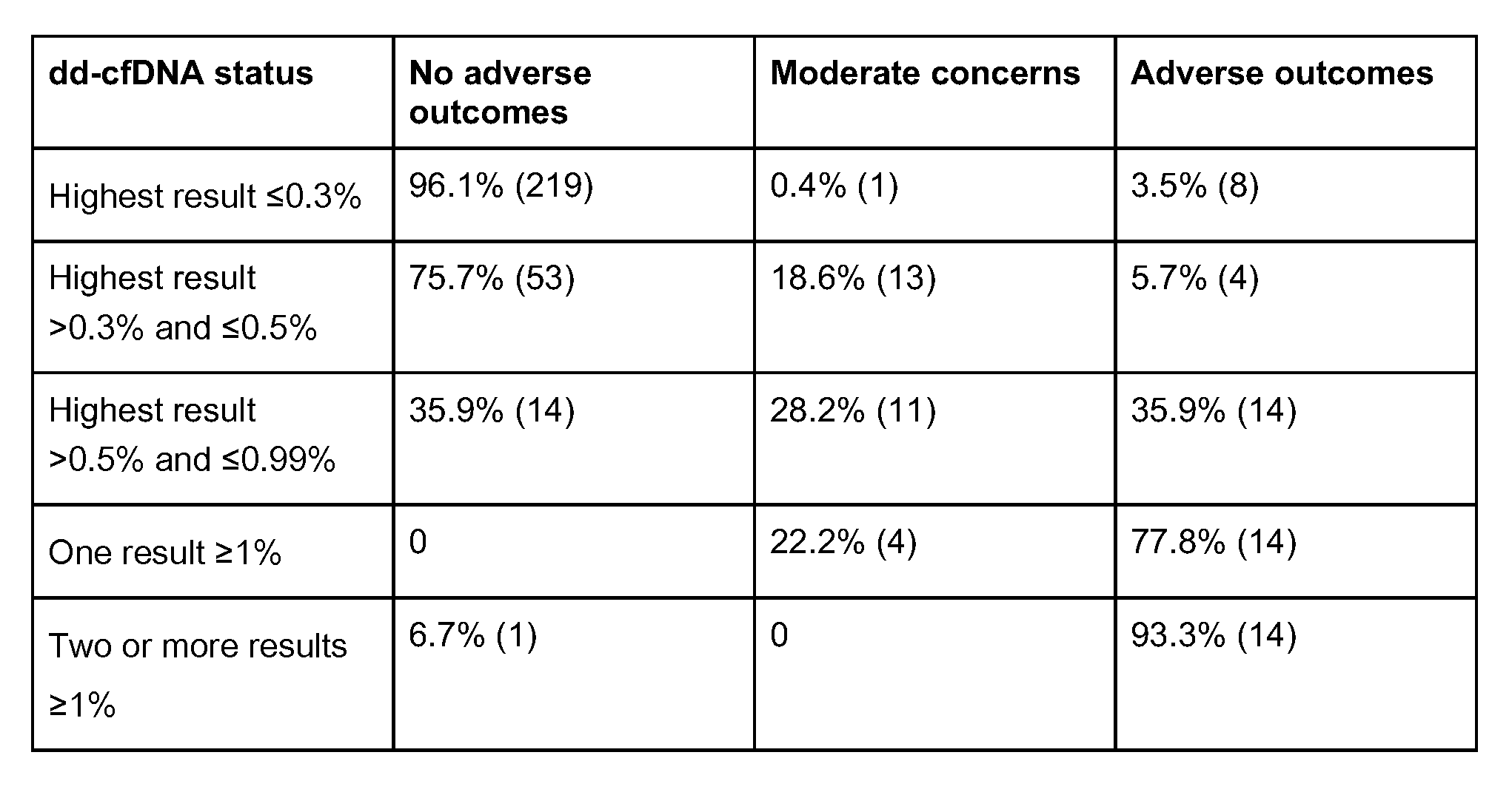 Results: 370 patients with 2040 total dd-cfDNA tests were included. Patients were categorized by pre-Tx risk, dd-cfDNA trends and outcomes (Figure 1). The majority of patients (61.6%; 228/370) had dd-cfDNA levels consistently below 0.3% and another 18.9% (70/370) stayed below 0.5% (Table 1). Unremarkable pre-Tx risk status was associated with dd-cfDNA levels consistently below 0.3% (p=0.025). dd-cfDNA levels consistently below 0.3% were associated with a low incidence of adverse events, while elevated dd-cfDNA (highest dd-cfDNA result >0.5%) was associated with a high incidence of adverse outcomes, (p <0.0001). 35.9% of patients with a highest dd-cfDNA result between >0.5% and <0.99% had an adverse outcome, compared to 77.8% and 93.3% of patients with 1 and 2+ dd-cfDNA results >1%, respectively. Win ratio for patients below 0.3% dd-cfDNA was 2.48 (1.31-4.68).