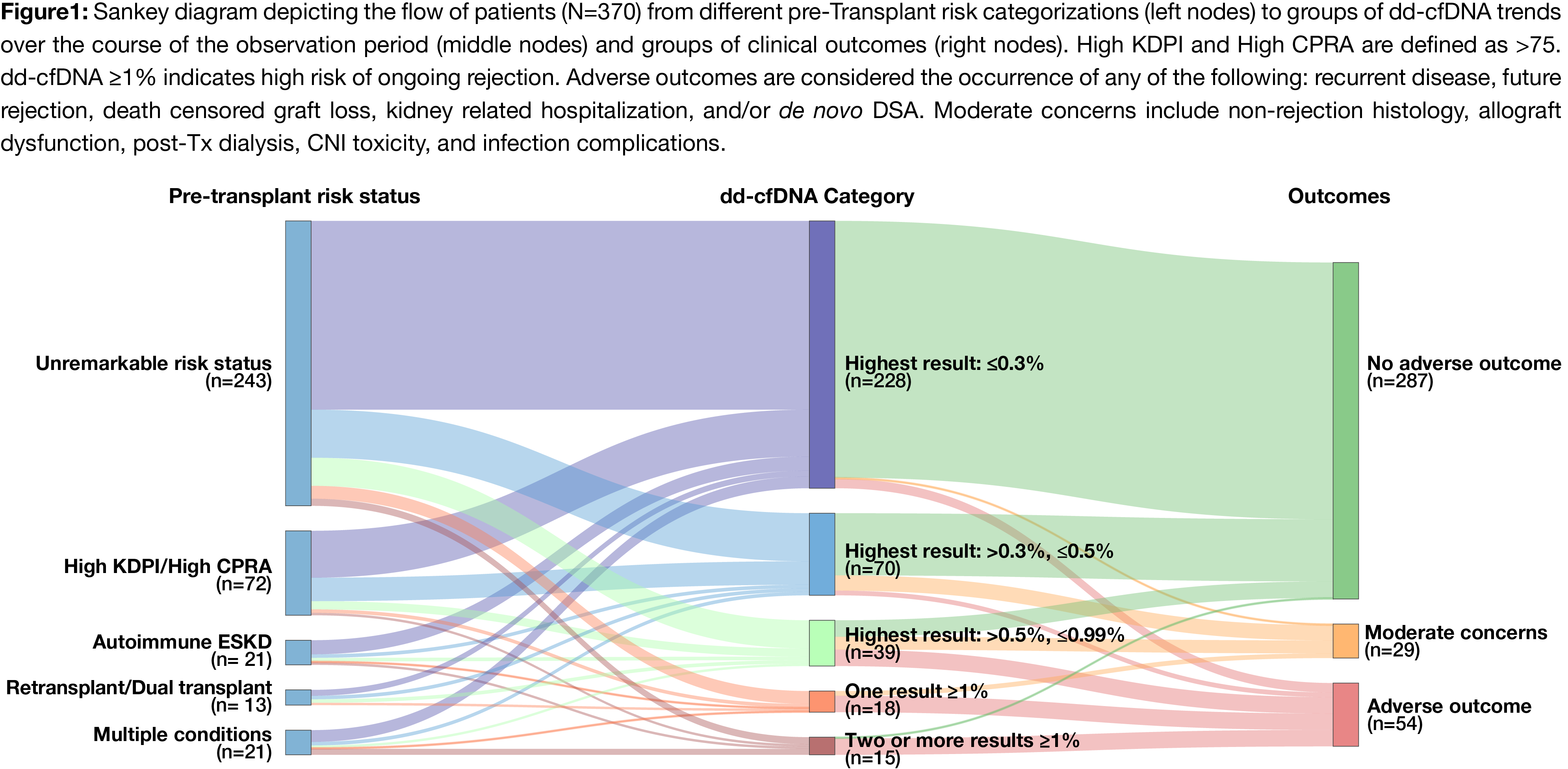 Methods: Kidney Tx patients from a preliminary analysis of the ProActive (NCT04091984) study that had no biopsy proven rejection within 18 months of Tx and >3 dd-cfDNA tests (the ProsperaTM test, Natera, Austin, TX) performed between 90 days and 18 months post-Tx were included in the analysis. Patients were categorized into risk categories based on their pre-Tx metrics and into dd-cfDNA categories based on longitudinal trends (Figure 1). Patient outcomes were assessed through 24 months post-Tx. Associations between patient status at the time of Tx, dd-cfDNA trends and outcomes were analyzed.