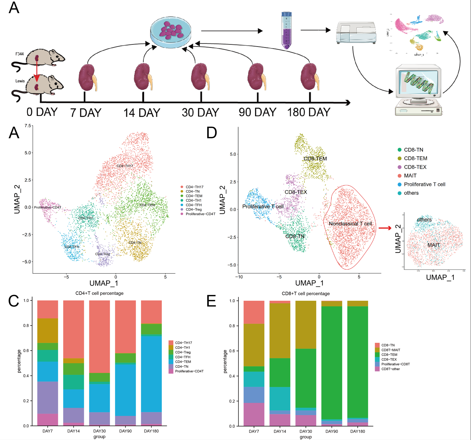 Methods: A chronic rejection model of kidney transplantation was established in rats (F344 to Lewis strain).Renal allografts were harvested for single-cell transcriptomic sequencing on days 7,14,30,90,and 180 post-operation. Monocle2 was used to delineate the evolutionary trajectory of Th17 subgroups, and Cellchat was utilized to investigate cellular communication networks. Immunofluorescence was performed to confirm changes in TH17 and MAIT cell infiltration.