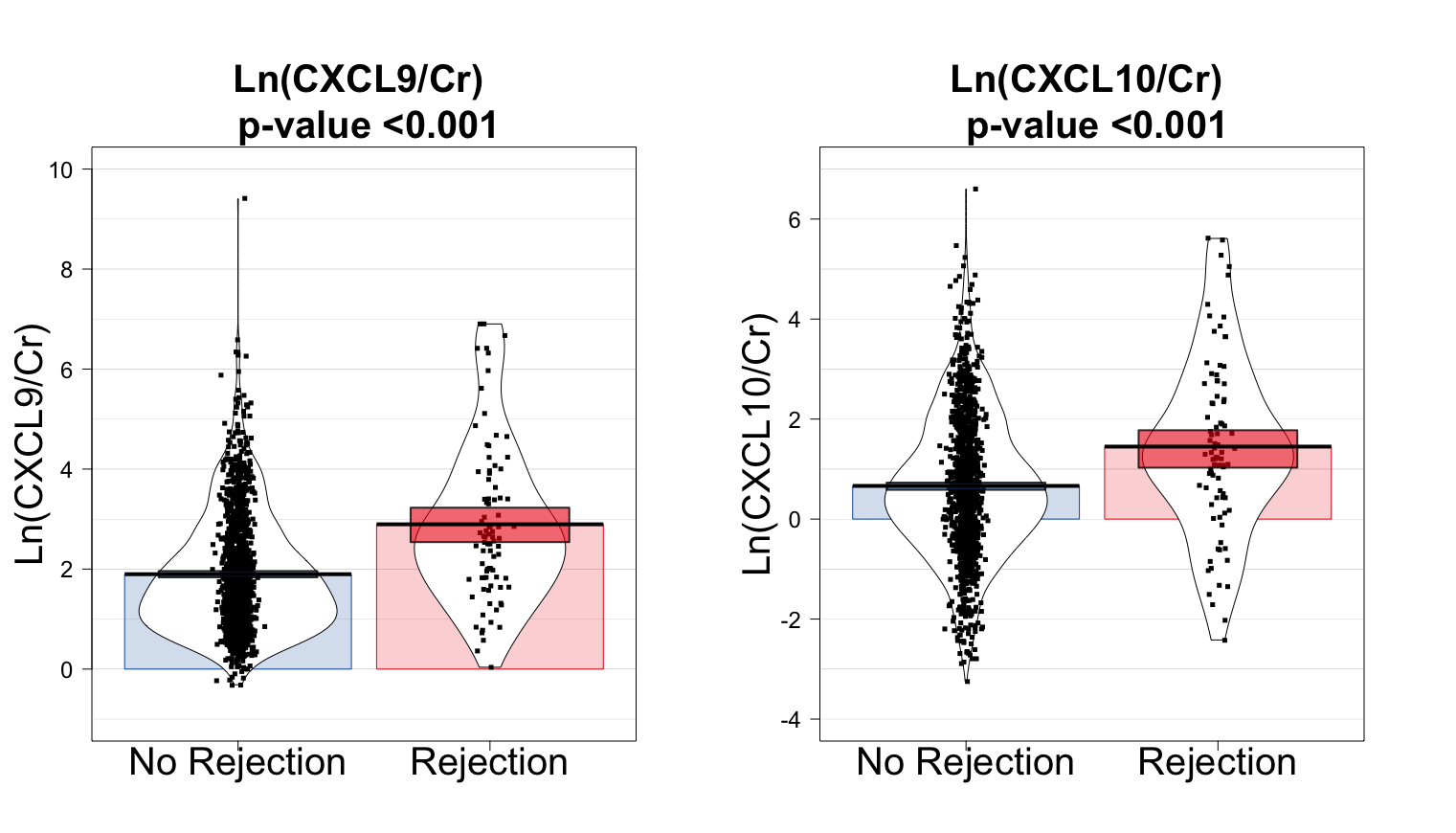 Results: Overall, 733 patients were included in the main analysis, with 1,549 biopsies paired with a urine sample. The median follow-up after transplantation was 12.3 months (interquartile range, 11.9-13.1 months). The cumulative incidence of rejection per patient was 9.7% (95% confidence interval [CI], 7.6%-12.1%). Urinary CXCL9 and CXCL10 levels were significantly associated with allograft rejection (p < 0.001 for both, Figure 1).