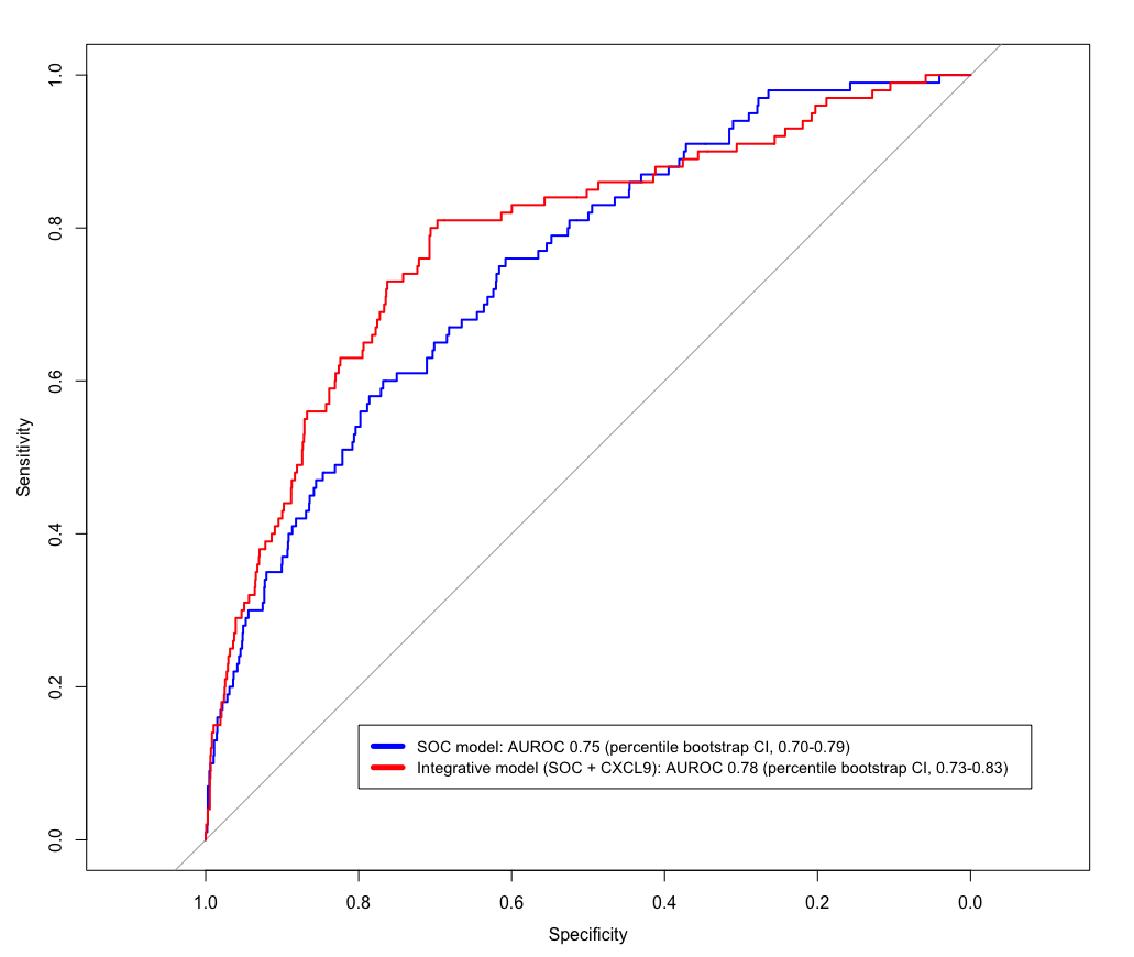 Urinary CXCL9 levels, but not urinary CXCL10 levels, showed an additional value beyond SOC parameters for predicting allograft rejection (area under the receiver operating characteristic curve [AUROC] of the SOC + CXCL9 model = 0.78, percentile bootstrap CI 0.73-0.83; AUROC of the SOC model = 0.75, percentile bootstrap CI 0.70-0.79; Figure 2).