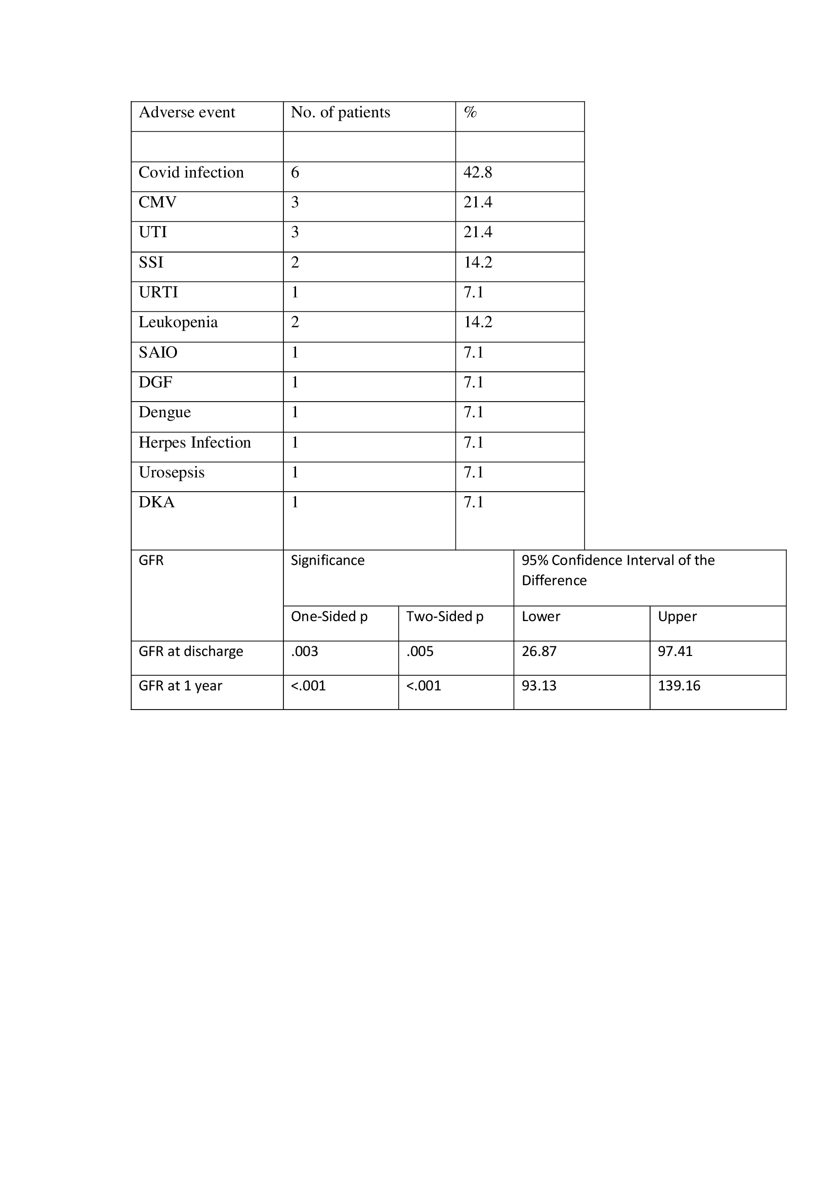 The mean (SD) eGFR remained stable at 24– and 36 months post-transplant with the decrease in mean (SD) eGFR to 104 (17) mL/min/1.73m2 at mean follows up of 31 (23.5) months. Rejection was noticed in 1/14 transplant recipients and 1/14 had Delayed graft function, no vascular and urinary complications were seen in any of the patients. 6/14 patients (42.8%) had covid infection post-transplant, 3/14 patients (21.4) had Urinary tract infection and 2/14 patients (14.2) had surgical site infection.