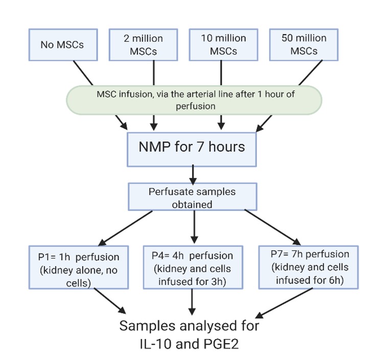 Conclusion: This pilot study indicates that a significant rise in perfusate PGE2 concentration occurs during NMP (and is increased by MSCs-infusion) while the role of IL-10 remains unclear, despite a potential trend towards increased levels in the presence of MSCs. Further studies are required to understand how NMP and cellular therapies can affect the kidney secretome and biology during preservation.