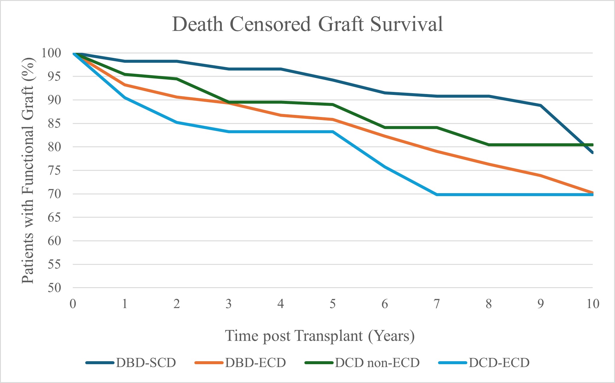 Methods: We performed a retrospective cohort study of all adult KTx recipients from deceased donors, from Sept 1, 2011 to Sept 30, 2022. Patients were classified into four subgroups: DBD-SCD (standard criteria donor), DBD-ECD (expanded criteria donor), DCD non-ECD, and DCD-ECD. The primary outcome was death censored graft survival (DCGS). Secondary outcomes included: Primary non-function (PNF), delayed graft function (DGF), death with graft function, incidence of first acute rejection and estimated glomerular filtration (eGFR) rate over time.