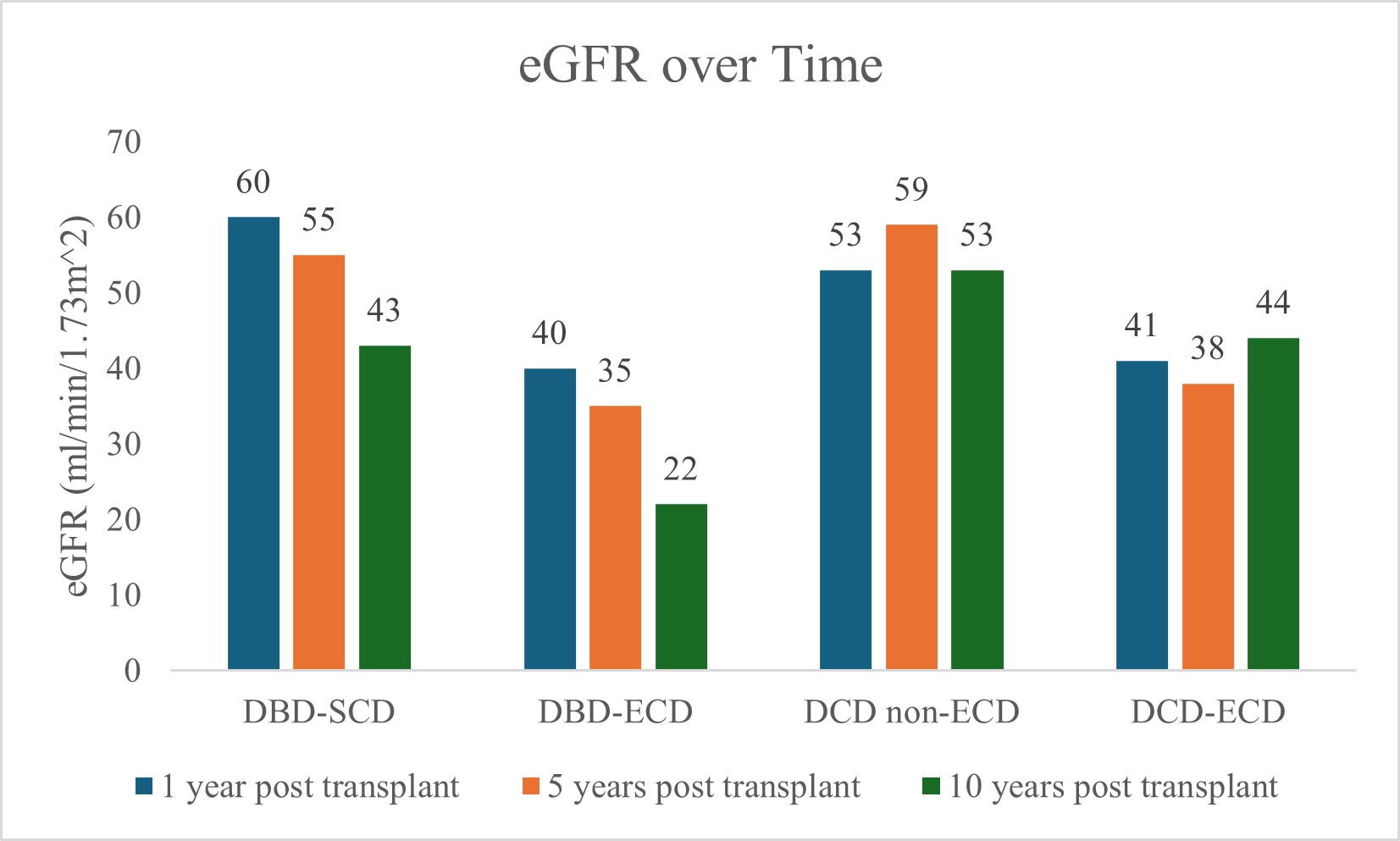 Results: We included 940 patients, 757 (80.4%) with KTx from DBD and 183 (19.6%) from DCD. 65.2% were male. We excluded 170 living donor recipients. Amongst the DBD kidneys, 369 (48.7%) were from SCD and 388 (51.3%) from ECD. Among the DCD kidneys, 114 (62.3%) were from non-ECD, and 69 (37.7%) from ECD. DCD kidneys included 37 (20%) from donors having medical assistance in dying (MAiD). Immunosuppression consisted of alemtuzumab induction and maintenance tacrolimus and mycophenolate sodium. Maintenance prednisone was used in highly sensitized patients. At 10 years, DCGS differed significantly among the four subgroups: 78.8% in DBD-SCD, 70.2% in DBD-ECD, 80.4% in DCD non-ECD, and 69.8% in DCD-ECD (p<0.01). PNF did not differ significantly between groups: 1.63% in DBD-SCD, 4.38% in DBD-ECD, 3.51% in DCD non-ECD, and 5.8% in DCD-ECD (p=0.11). The incidence of DGF was as follows: 22.8% in DBD-SCD, 23.2% in DBD-ECD, 45.6% in DCD non-ECD, and 44.9% in DCD-ECD (p<0.01). Death with graft function at 10-years differed significantly among the four subgroups: 21.5% in DBD-SCD, 48.8% in DBD-ECD, 11.6% in DCD non-ECD, and 34.6% in DCD-ECD (p<0.01). The incidence of acute rejection at 1-year was 8.5% in DBD-SCD, 15.4% in DBD-ECD, 14.2% in DCD non-ECD, and 10.7% in DCD-ECD (p=0.09). Median eGFR (ml/min/1.73 m2) at 1-, 5- and 10-years differed between subgroups: DBD-SCD (60, 55, 43), DCD-ECD (40, 35, 22), DCD non-ECD (53, 59, 53), and DBD-ECD (41, 38, 44) (1-year: p<0.01, 5-years: p<0.01, and 10-years: p=0.23). Among the MAiD donor recipients, DCGS was 79.3% and death with graft function was 8% at 5-years.
