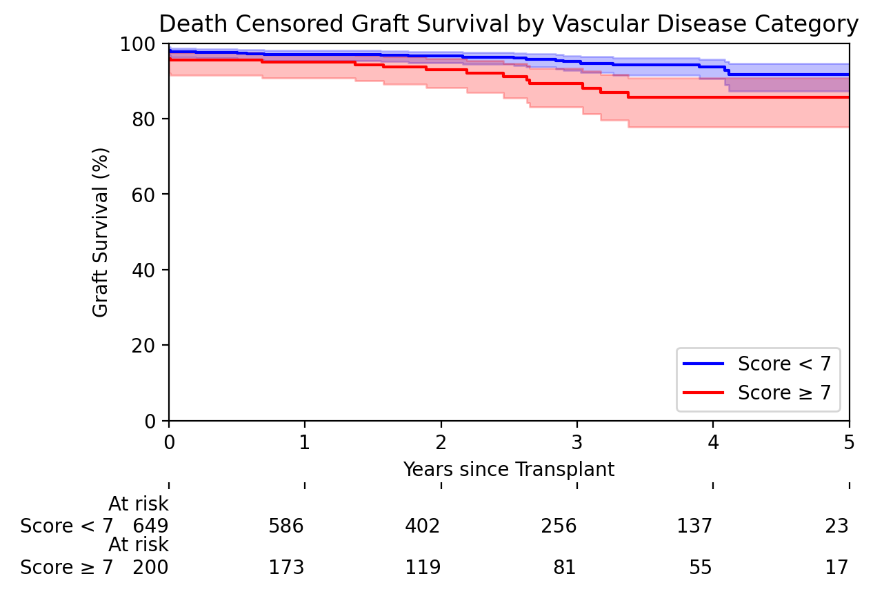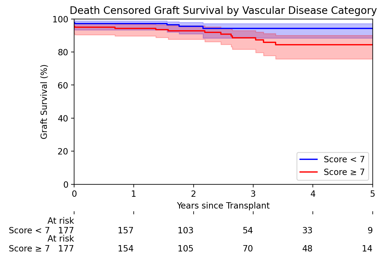 Results: During the study period (August 2017-July 2022), 851 implantation biopsies were available for analysis. When patients were categorized into two groups using the aggregated vascular score (2cv+ah+aah, ≥7 vs <7), 5-year death-censored graft survival was worse in the high score group: 86% vs 92%, p=0.01 for the entire cohort and 84% vs 94%, p=0.05 for the PS-matched cohort.
