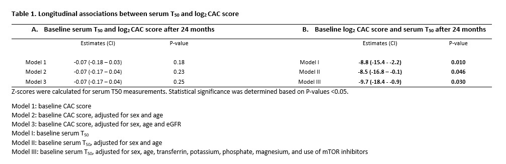 Results: At baseline, 196 KTRs (mean age 54±15 years, 61% male, 70% with CAC) were included, with a median CAC score of 46 [0 – 470] Agatston units. Multivariable regression analysis revealed that mTOR inhibitor use, lower serum potassium or phosphate, and higher serum magnesium or transferrin were independently associated with higher serum T50. At baseline, serum T50 was associated with CAC score, independent of sex, age, and eGFR. However, baseline serum T50 was not significantly associated with CAC score at follow-up (Table 1A). In contrast, baseline CAC score significantly inversely correlated with serum T50 at follow-up, even after adjustment for sex, age, and correlates of serum T50 (Table 1B).