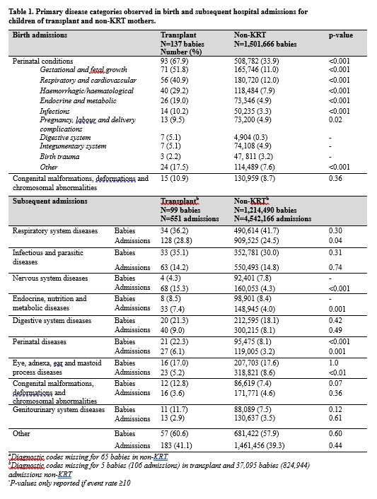 Results: Of 1,865,425 babies with 6,063,327 hospital admissions, there were 137 birth admissions and 551 subsequent admissions (n=99 babies) in the transplant cohort, with a median follow-up duration of 2.5 years [IQR: 0.9-5.3] compared to 2.9 years [1.1-5.4] in the non-KRT cohort (p=0.03). Neonatal deaths (<28 days post-delivery) were 3.5% in the transplant cohort (0.2% non-KRT), with just one post-neonatal death. Children of transplanted mothers experienced lengthier birth admissions (median 6 days [IQR: 4-16]) than those of non-KRT mothers (3 days [2-5]), p<0.001. Nearly 70% of children born to transplanted mothers (vs 34% non-KRT) had perinatal-related admissions, associated with gestational age/fetal growth issues, respiratory/cardiovascular diseases, haemorrhagic/haematological conditions, endocrine/metabolic disorders, infections and pregnancy complications, 2-5 times higher than the non-KRT cohort (p<0.05) (Table 1). Subsequent admissions for respiratory, nervous system, and endocrine/metabolic diseases were also more prevalent in children of transplanted mothers (7-29%) than the non-KRT (4-24%), p<0.05. Prematurity (57% Transplant vs 8% non-KRT) and pre-eclampsia (30% Transplant vs 6% non-KRT) were further explored as crucial factors affecting neonatal health. Preterm children of transplanted mothers showed heightened respiratory-related subsequent admissions (41%) compared to other preterm children (26%, p<0.001). Among women with pregnancy-induced hypertension (including pre-eclampsia), children of transplanted mothers had higher rates of perinatal conditions (80% vs 51%), endocrine/metabolic diseases (8% vs 4%), and respiratory diseases (35% vs 23%), p<0.05.