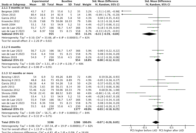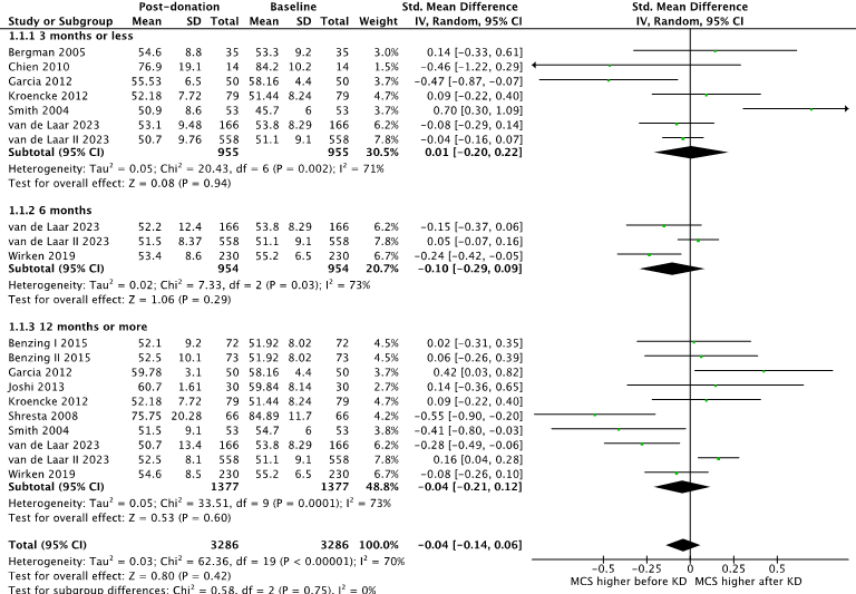 A total of 70 studies encompassing 15,666 patients were included in this meta-analysis. The MCS did not show a significant difference at 3, 6, and 12 or more months post-transplantation compared to baseline (Figure 1), with an overall standard mean difference (SMD) of -0.04 (95% CI: -0.14 to 0.06, p = 0.75). However, the PCS demonstrated a significantly lower HRQoL at 3 months (Figure 2), with an SMD of -0.31 (95% CI: -0.59 to -0.04, p = 0.02). Nonetheless, no significant differences were observed at 6 and 12 months post-transplantation, with an overall SMD of -0.07 (95% CI: -0.20 to 0.05, p = 0.09).
